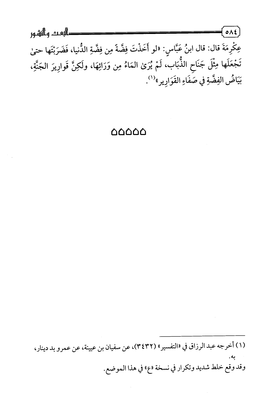 886 - أَخْبَرَنَا أَبُو نَصْرِ بْنُ قَتَادَةَ، أخبرنا أَبُو مَنْصُورٍ النَّضْرَوِيُّ، حدثنا أَحْمَدُ بْنُ نَجْدَةَ، حدثنا سَعِيدُ بْنُ مَنْصُورٍ، حدثنا سفيان، عن عمرو، عن عكرمة قال: قال ابن عباس: "لو أخذت فضة من فضة الدنيا، فضربتها حتى تجعلها مثل جناح الذباب، لم يرى الماء من ورائها، ولكن قوارير الجنة، بياض الفضة في صفاء القوارير".