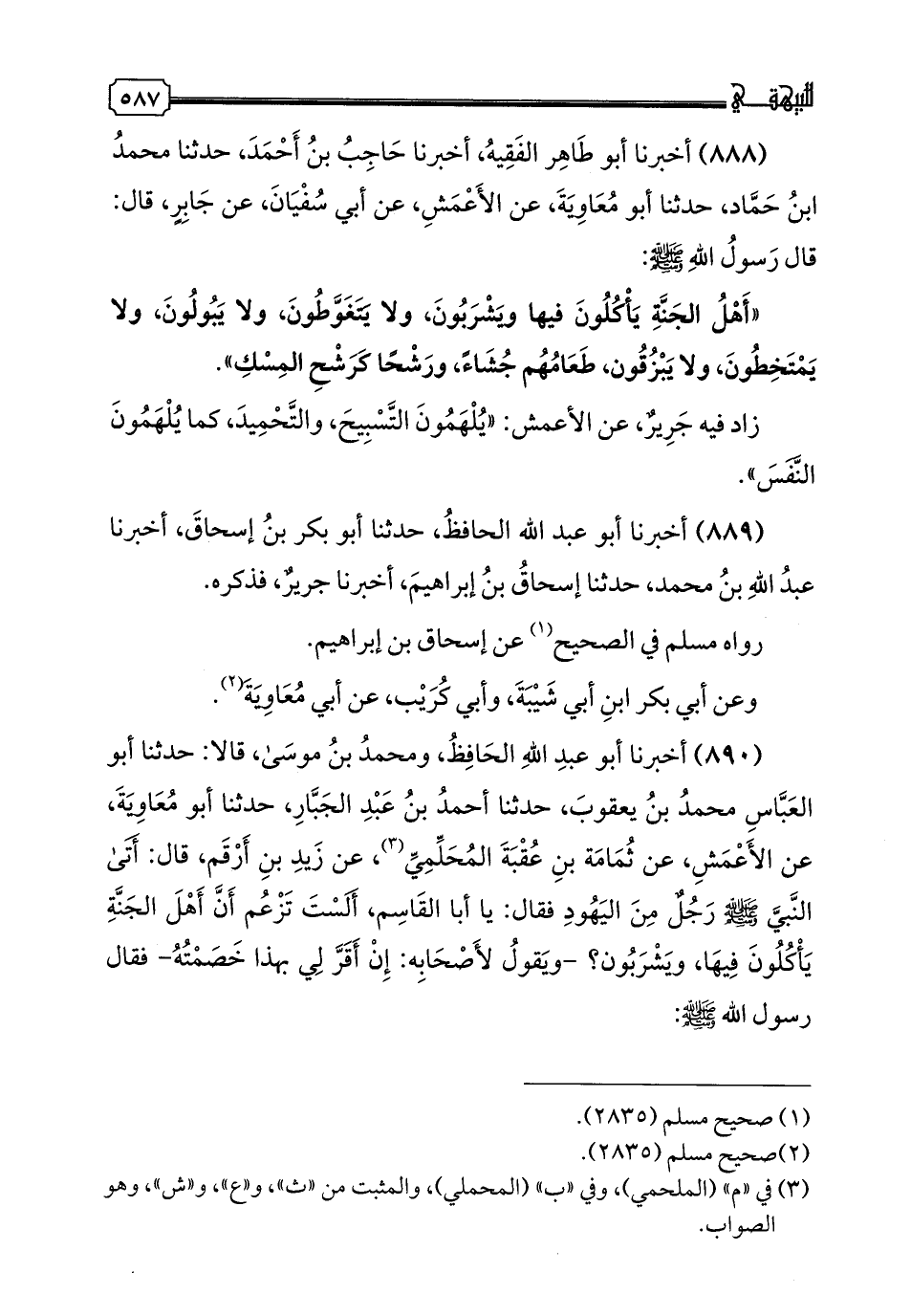 888 - أَخْبَرَنَا أَبُو طَاهِرٍ الْفَقِيهُ، أخبرنا حَاجِبُ بْنُ أَحْمَدَ، حدثنا مُحَمَّدُ بْنُ حَمَّادٍ، حدثنا أَبُو مُعَاوِيَةَ، عَنِ الْأَعْمَشِ، عَنْ أَبِي سُفْيَانَ، عَنْ جَابِرٍ، قَالَ: قَالَ رَسُولُ اللَّهِ صَلَّى اللهُ عَلَيْهِ وَسَلَّمَ: «أَهْلُ الْجَنَّةِ يَاكُلُونَ فِيهَا وَيَشْرَبُونَ، وَلَا يَتَغَوَّطُونَ، وَلَا يَبُولُونَ، وَلَا يَتَمَخَّطُونَ، وَلَا يَبْزُقُونَ طَعَامَهُمْ جُشَاءً، وَرَشْحًا كَرَشْحِ الْمِسْكِ». زَادَ فِيهِ جَرِيرٌ، عَنِ الْأَعْمَشِ: «يُلْهَمُونَ التَّسْبِيحَ، وَالتَّحْمِيدَ، كَمَا يُلْهَمُونَ النَّفَسَ»