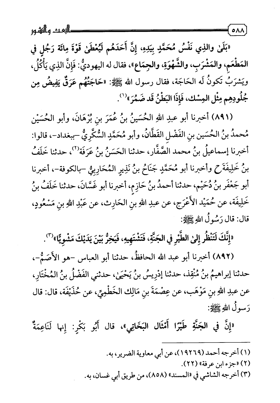 وَأَخْبَرَنَا أَبُو مُحَمَّدٍ جَنَاحُ بْنُ نَذِيرٍ الْمُحَارِبِيُّ -بِالْكُوفَةِ-، أخبرنا أَبُو جَعْفَرِ بْنُ دُحَيْمٍ، حدثنا أَحْمَدُ بْنُ حَازِمٍ، أخبرنا أَبُو غَسَّانَ، حدثنا خَلَفُ بْنُ خَلِيفَةَ، عَنْ حُمَيْدٍ الْأَعْرَجِ، عَنْ عَبْدِ اللَّهِ بْنِ الْحَارِثِ، عَنْ عَبْدِ اللَّهِ بْنِ مَسْعُودٍ، قَالَ: قَالَ رَسُولُ اللَّهِ صَلَّى اللهُ عَلَيْهِ وَسَلَّمَ: «إِنَّكَ لَتَنْظُرُ إِلَى الطَّيْرِ فِي الْجَنَّةِ، فَتَشْتَهِيهِ، فَيَخِرُّ بَيْنَ يَدَيْكَ مَشْوِيًّا».