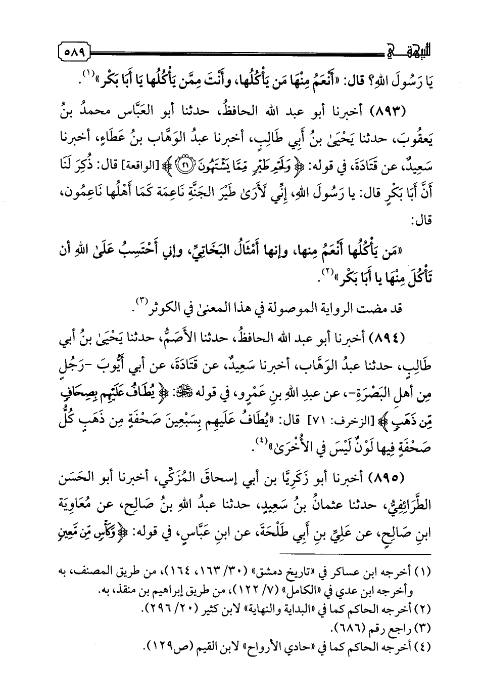 893 - أَخْبَرَنَا أَبُو عَبْدِ اللَّهِ الْحَافِظُ، حدثنا أَبُو الْعَبَّاسِ مُحَمَّدُ بْنُ يَعْقُوبَ، حدثنا يَحْيَى بْنُ أَبِي طَالِبٍ، أخبرنا عَبْدُ الْوَهَّابِ بْنُ عَطَاءٍ، أخبرنا سَعِيدٌ، عَنْ قَتَادَةَ، فِي قَوْلِهِ: {وَلَحْمِ طَيْرٍ مِمَّا يَشْتَهُونَ} قَالَ: ذُكِرَ لَنَا أَنَّ أَبَا بَكْرٍ قَالَ: " يَا رَسُولَ اللَّهِ، إِنِّي لَأَرَى طَيْرَ الْجَنَّةِ نَاعِمَةً كَمَا أَهْلُهَا نَاعِمُونَ. قَالَ: «مَنْ يأكُلُهَا أَنْعَمُ مِنْهَا، وَإِنَّهَا أَمْثَالُ الْبَخَاتِيِّ، وَإِنِّي أَحْتَسِبُ عَلَى اللَّهِ أَنْ تأكُلَ مِنْهَا يَا أَبَا بَكْرٍ» قَدْ مَضَتِ الرِّوَايَةُ الْمَوْصُولَةُ فِي هَذَا الْمَعْنَى فِي الْكَوْثَرِ.