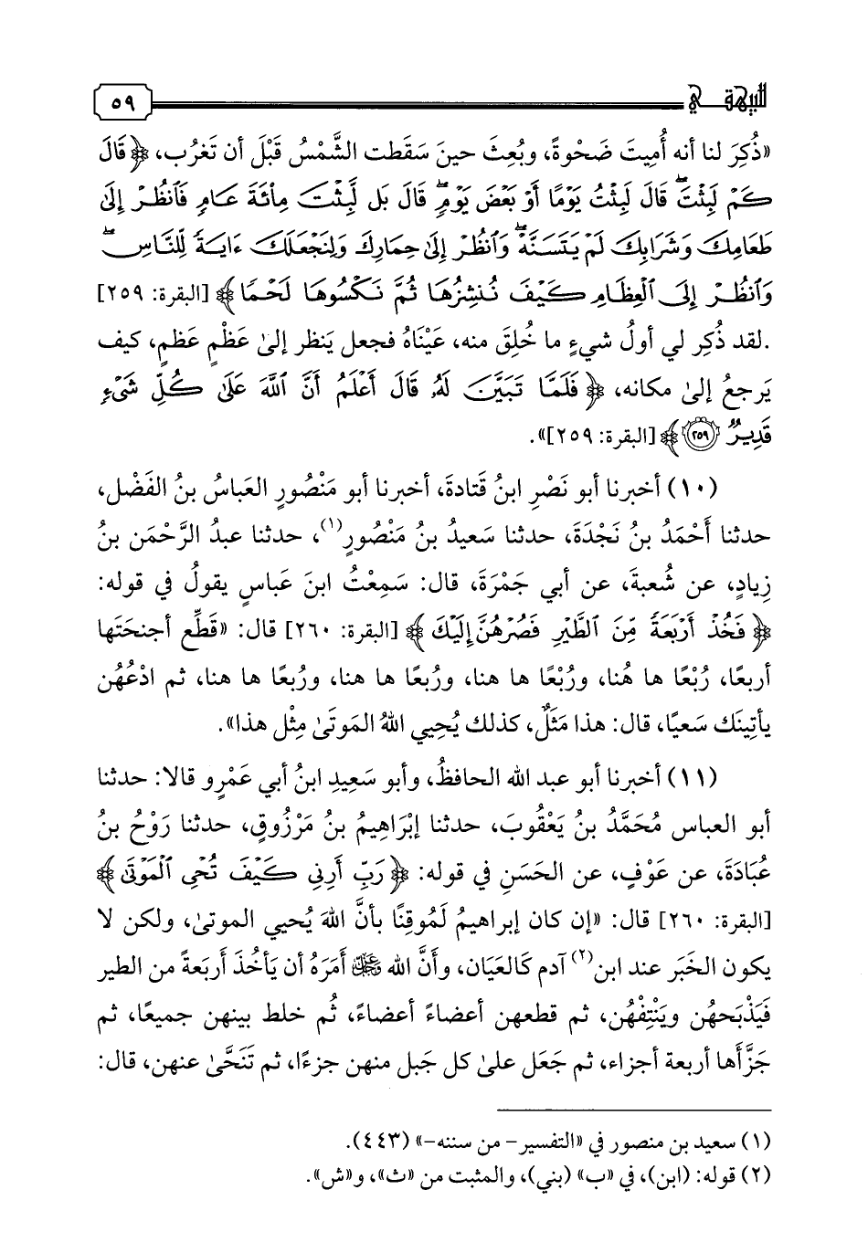 10 - أخبرنا أبو نصر ابن قتادة، أخبرنا أبو منصور العباس بن الفضل، حدثنا أحمد بن نجدة، حدثنا سعيد بن منصور، حدثنا عبد الرحمن بن زياد، عن شعبة، عن أبي جمرة، قال: سمعت ابن عباس يقول في قوله: {فخذ أربعة من الطير فصرهن إليك} قال: "قطع أجنحتها أربعا، ربعا ها هنا، وربعا ها هنا، وربعا ها هنا، وربعا ها هنا، ثم ادعهن يأتينك سعيا، قال: هذا مثل، كذلك يحيى الله الموتى مثل هذا".