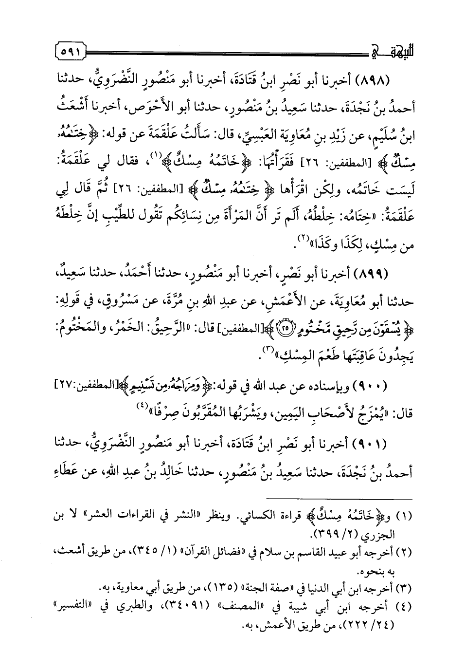 901 - أَخْبَرَنَا أَبُو نَصْرِ بْنُ قَتَادَةَ، أخبرنا أَبُو مَنْصُورٍ النَّضْرَوِيُّ، حدثنا أَحْمَدُ بْنُ نَجْدَةَ، حدثنا سَعِيدُ بْنُ مَنْصُورٍ، حدثنا خَالِدُ بْنُ عَبْدِ اللَّهِ، عَنْ عَطَاءِ بْنِ السَّائِبِ، عَنْ سَعِيدِ بْنِ جُبَيْرٍ، عَنِ ابْنِ عَبَّاسٍ، فِي قَوْلِهِ: {وَمِزَاجُهُ مِنْ تَسْنِيمٍ عَيْنًا يَشْرَبُ بِهَا الْمُقَرَّبُونَ}، قَالَ: «يَشْرَبُ مِنْهَا الْمُقَرَّبُونَ صِرْفًا، وَتُمْزَجُ لِمَنْ دُونَهُمْ»