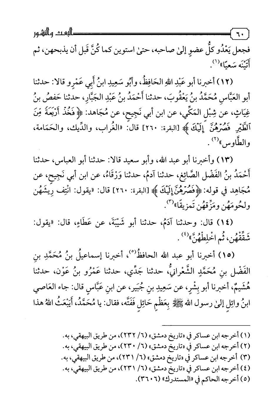 13 - وأخبرنا أبو عبد الله، وأبو سعيد قالا: حدثنا أبو العباس، حدثنا أحمد بن الفضل الصائغ، حدثنا آدم، حدثنا ورقاء، عن ابن أبي نجيح، عن مجاهد في قوله: {فصرهن إليك} قال: "يقول: انتف ريشهن ولحومهن ومزقهن تمزيقا".
