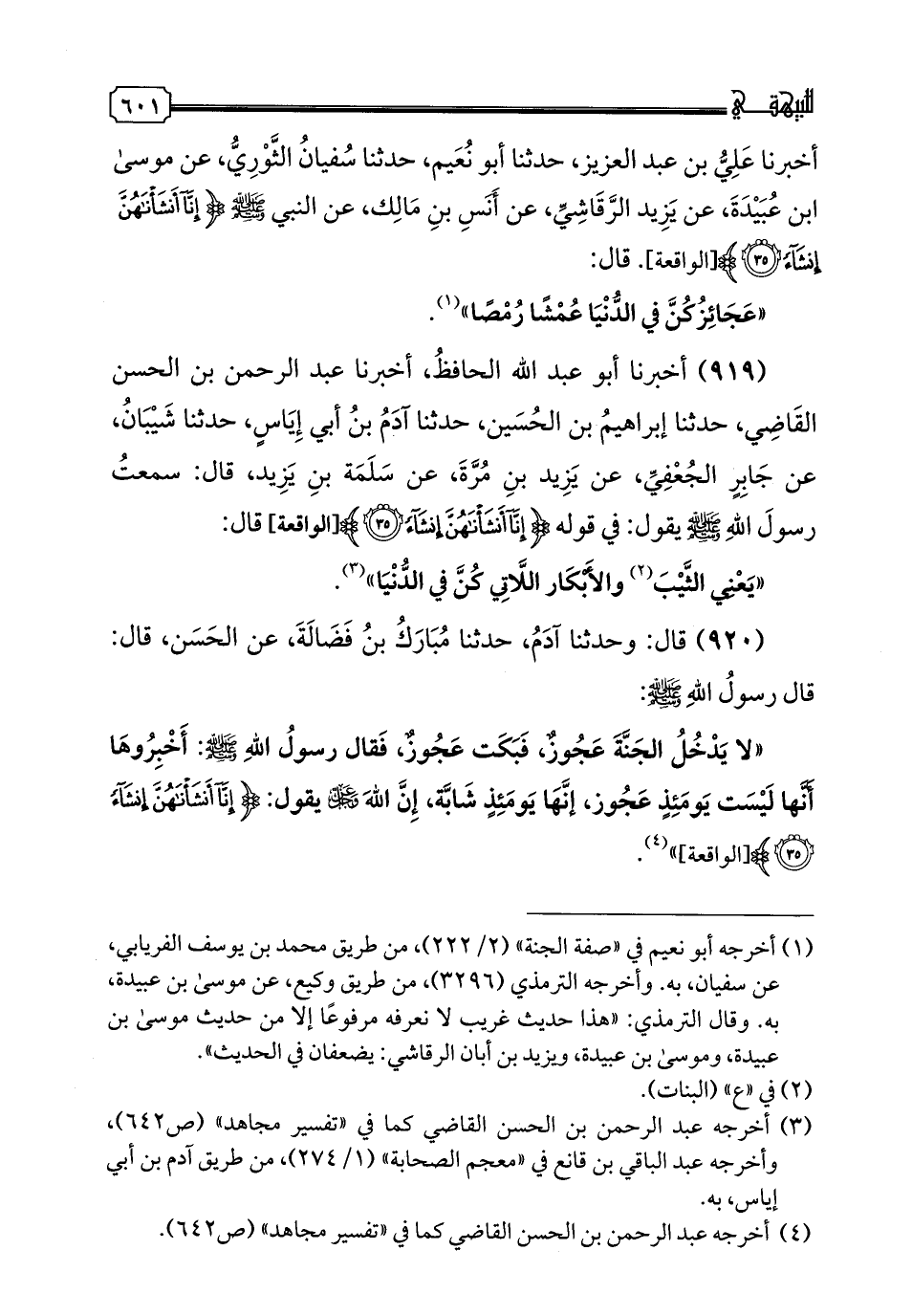920 - قَالَ: وحدثنا آدَمُ، حدثنا مُبَارَكُ بْنُ فَضَالَةَ، عَنِ الْحَسَنِ، قَالَ: قَالَ رَسُولُ اللَّهِ صَلَّى اللهُ عَلَيْهِ وَسَلَّمَ: " لَا يَدْخُلُ الْجَنَّةَ عَجُوزٌ، فَبَكَتْ عَجُوزٌ، فَقَالَ رَسُولُ اللَّهِ صَلَّى اللهُ عَلَيْهِ وَسَلَّمَ: «أَخْبِرُوهَا أَنَّهَا لَيْسَتْ يَوْمَئِذٍ عَجُوزٌ إِنَّهَا يَوْمَئِذٍ شَابَّةٌ»، إِنَّ اللَّهَ عَزَّ وَجَلَّ يَقُولُ: {إِنَّا أَنْشَأنَاهُنَّ إِنْشَاءً}