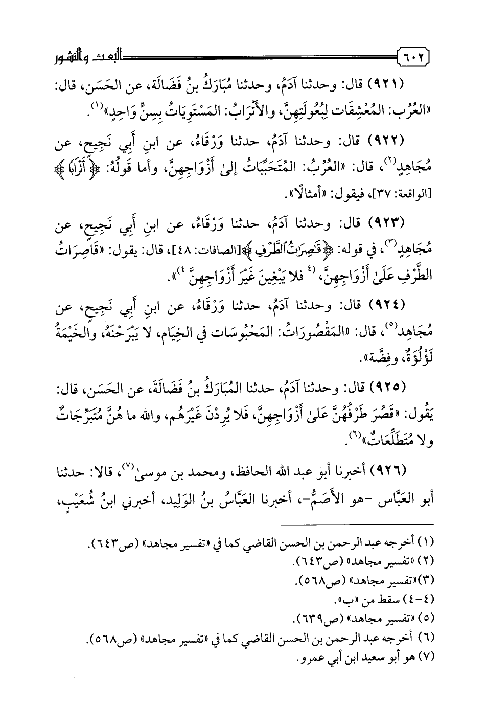 923 - قال: وحدثنا آدَمُ، حدثنا وَرْقَاءُ، عَنِ ابْنِ أَبِي نَجِيحٍ، عَنْ مُجَاهِدٍ، فِي قَوْلِهِ: {قَاصِرَاتُ الطَّرْفِ}، قَالَ: يَقُولُ: «قَاصِرَاتُ الطَّرْفِ عَلَى أَزْوَاجِهِنَّ، فَلَا يَبْغين غَيْرَ أَزْوَاجِهِنَّ»