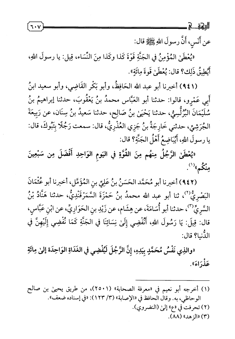 942 - أَخْبَرَنَا أَبُو مُحَمَّدٍ الْحَسَنُ بْنُ عَلِيِّ بْنِ الْمُؤَمَّلِ، أخبرنا أَبُو عُثْمَانَ البصري (1)، ثنا أَبُو عَبْدِ اللَّهِ مُحَمَّدُ بْنُ حَمْزَةَ السَّمَرْقَنْدِيُّ، حدثنا هَنَّادُ بْنُ السَّرِيِّ، حدثنا أَبُو أُسَامَةَ، عَنْ هِشَامٍ، عَنْ زَيْدِ بْنِ الْحَوَارِيِّ، عَنِ ابْنِ عَبَّاسٍ، قَالَ: قِيلَ: يَا رَسُولَ اللَّهِ أَنُفْضِي إِلَى نِسَائِنَا فِي الْجَنَّةِ كَمَا نُفْضِي إِلَيْهِنَّ فِي الدُّنْيَا؟ قَالَ: «وَالَّذِي نَفْسُ مُحَمَّدٍ بِيَدِهِ إِنَّ الرَّجُلَ لَيُفْضِي فِي الْغَدَاةِ الْوَاحِدَةِ إِلَى مِائَةِ عَذْرَاءَ»