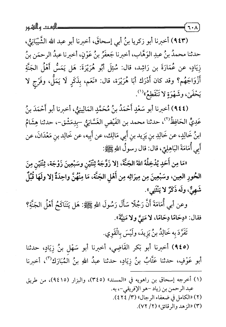 944 - أَخْبَرَنَا أَبُو سَعْدٍ أَحْمَدُ بْنُ مُحَمَّدٍ الْمَالِينِيُّ، أخبرنا أَبُو أَحْمَدَ بْنُ عَدِيٍّ الْحَافِظُ، حدثنا مُحَمَّدُ بْنُ الْفَيْضِ الْغَسَّانَيُّ، -بِدِمَشْقَ-، حدثنا هِشَامٌ بن خَالِدِ، عن خالد بْنِ يَزِيدَ بْنِ أَبِي مَالِكٍ، عَنْ أَبِيهِ، عَنْ خَالِدِ بْنِ مَعْدَانَ، عَنْ أَبِي أُمَامَةَ الْبَاهِلِيِّ، قَالَ: قَالَ رَسُولُ اللَّهِ صَلَّى اللهُ عَلَيْهِ وَسَلَّمَ: «مَا مِنْ أَحَدٍ يُدْخِلُهُ اللَّهُ الْجَنَّةَ، إِلَّا زَوَّجَهُ ثِنْتَيْنِ وَسَبْعِينَ زَوْجَةً، ثِنْتَيْنِ مِنَ الْحُورِ الْعَيْنِ، وَسَبْعِينَ مِنْ مِيرَاثِهِ مِنْ أَهْلِ الْجَنَّةِ، مَا مِنْهُنَّ وَاحِدَةٌ إِلَّا وَلَهَا قُبُلٌ شَهِيُّ، وَلَهُ ذَكَرٌ لَا يَنْثَنِي»