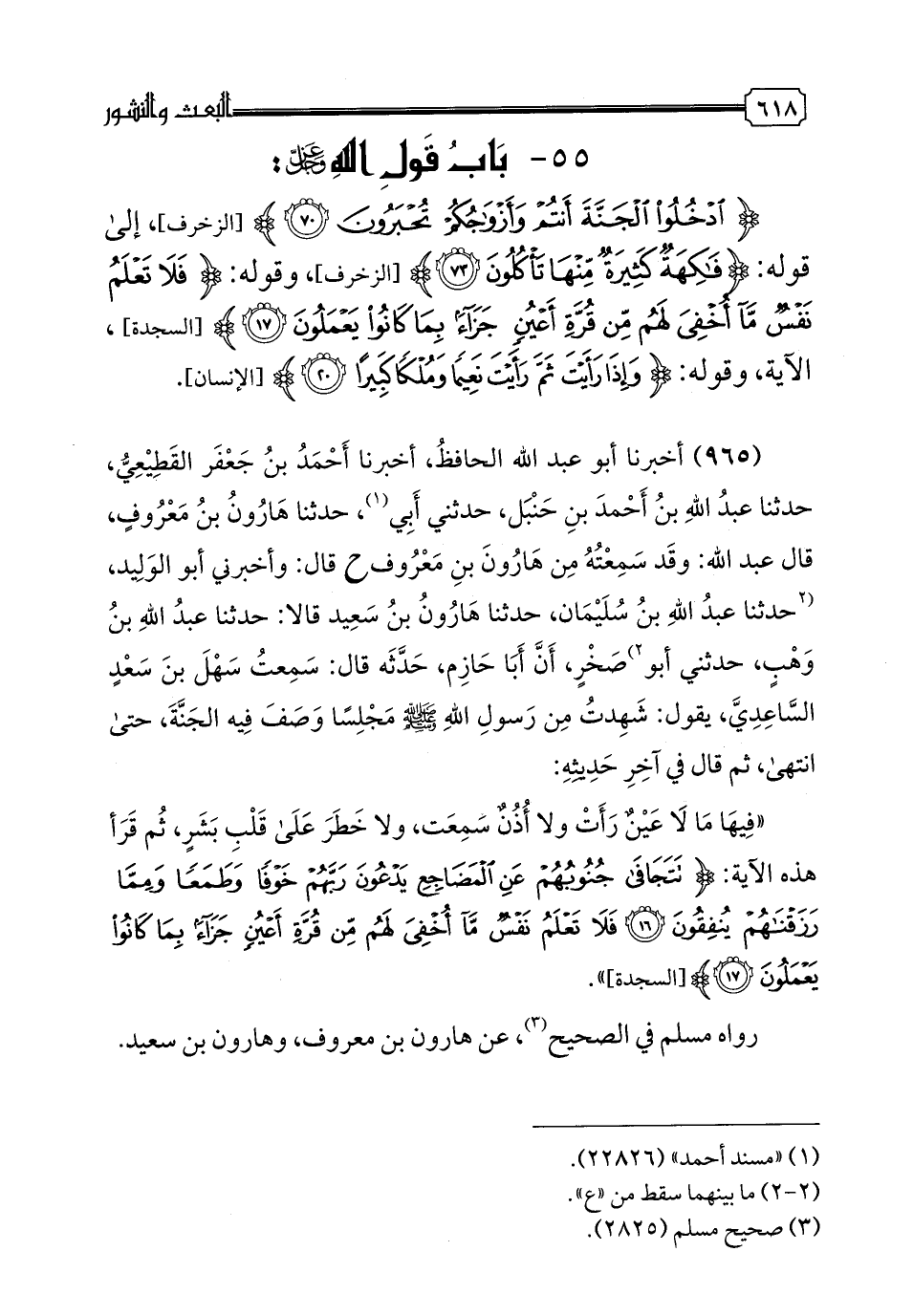 965 - أَخْبَرَنَا أَبُو عَبْدِ اللَّهِ الْحَافِظُ، أخبرنا أَحْمَدُ بْنُ جَعْفَرٍ الْقَطِيعِيُّ، حدثنا عَبْدُ اللَّهِ بْنُ أَحْمَدَ بْنِ حَنْبَلٍ، حَدَّثَنِي أَبِي، حدثنا هَارُونُ بْنُ مَعْرُوفٍ، قَالَ عَبْدُ اللَّهِ: وَقَدْ سَمِعْتُهُ مِنْ هَارُونَ بْنِ مَعْرُوفٍ ح قَالَ: (وأخبرني أبو الوليد، حدثنا عبد الله بن سليمان، حدثنا هارون بن سعيد قالا: حدثنا عبد الله بن وهب) (1)، حدثني أَبُو صَخْرٍ، أَنَّ أَبَا حَازِمٍ، حَدَّثَهُ قَالَ: سَمِعْتُ سَهْلَ بْنَ سَعْدٍ السَّاعِدِيَّ، يَقُولُ: شَهِدْتُ مِنْ رَسُولِ اللَّهِ صَلَّى اللهُ عَلَيْهِ وَسَلَّمَ مَجْلِسًا وَصَفَ فِيهِ الْجَنَّةَ، حَتَّى انْتَهَى، ثُمَّ قَالَ فِي آخِرِ حَدِيثِهِ: «فِيهَا مَا لَا عَيْنٌ رَأَتْ وَلَا أُذُنٌ سَمِعَتْ، وَلَا خَطَرَ عَلَى قَلْبِ بَشَرٍ»، ثُمَّ قَرَأَ هَذِهِ الْآيَةَ: {تَتَجَافَى جُنُوبُهُمْ عَنِ الْمَضَاجِعِ يَدْعُونَ رَبَّهُمْ خَوْفًا، وَطَمَعًا، وَمِمَّا رَزَقْنَاهُمْ يُنْفِقُونَ، فَلَا تَعْلَمُ نَفْسٌ مَا أُخْفِيَ لَهُمْ مِنْ قُرَّةِ أَعْيُنٍ جَزَاءً بِمَا كَانُوا يَعْمَلُونَ}