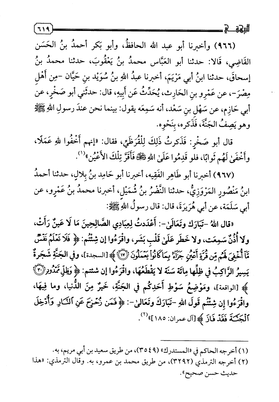 966 - وَأَخْبَرَنَا أَبُو عَبْدِ اللَّهِ الْحَافِظُ، وَأَبُو بَكْرٍ أَحْمَدُ بْنُ الْحَسَنِ الْقَاضِي، قَالَا: حدثنا أَبُو الْعَبَّاسِ مُحَمَّدُ بْنُ يَعْقُوبَ، حدثنا مُحَمَّدُ بْنُ إِسْحَاقَ، حدثنا ابْنُ أَبِي مَرْيَمَ، أخبرنا عَبْدُ اللَّهِ بْنُ سُوَيْدِ بْنِ حَيَّانَ، -مِنْ أَهْلِ مِصْرَ-، عَنْ عَمْرِو بْنِ الْحَارِثِ، يُحَدِّثُ عَنْ أَبِيهِ، قَالَ: حَدَّثَنِي أَبُو صَخْرٍ، عَنْ أَبِي حَازِمٍ، عَنْ سَهْلِ بْنِ سَعْدٍ، أَنَّهُ سَمِعَهُ يَقُولُ: بَيْنَمَا نَحْنُ عِنْدَ رَسُولِ اللَّهِ صَلَّى اللهُ عَلَيْهِ وَسَلَّمَ وَهُوَ يَصِفُ الْجَنَّةَ، فَذَكَرَهُ بِنَحْوِهِ. قَالَ أَبُو صَخْرٍ: فَذَكَرْتُ ذَلِكَ لِلْقُرَظِيِّ، فَقَالَ: «إِنَّهُمْ أَخْفَوْا لِلَّهِ عَمَلًا، وَأَخْفَى لَهُمْ ثَوَابًا فَلَوْ قدموا عَلَى اللَّهِ عَزَّ وَجَلَّ فَأَقَرَّ تِلْكَ الْأَعْيُنَ»