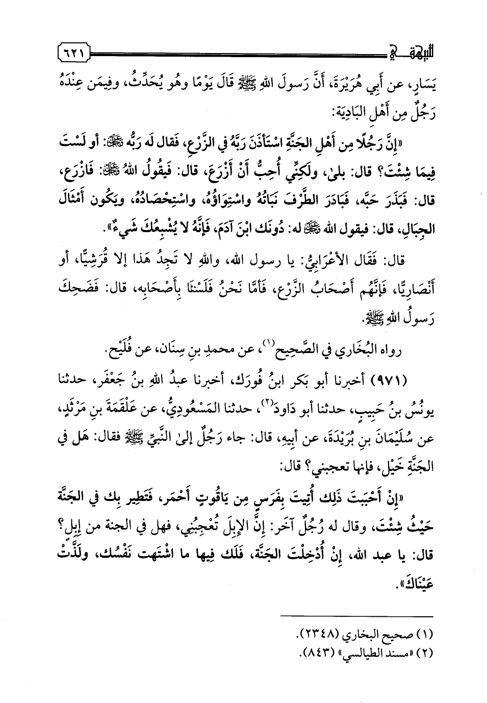 971 - أَخْبَرَنَا أَبُو بَكْرِ بْنُ فُورَكٍ، أخبرنا عَبْدُ اللَّهِ بْنُ جَعْفَرٍ، حدثنا يُونُسُ بْنُ حَبِيبٍ، حدثنا أَبُو دَاوُدَ، حَدَّثَنَا الْمَسْعُودِيُّ، عَنْ عَلْقَمَةَ بْنِ مَرْثَدٍ، عَنْ سُلَيْمَانَ بْنِ بُرَيْدَةَ، عَنْ أَبِيهِ، قَالَ: جَاءَ رَجُلٌ إِلَى النَّبِيِّ صَلَّى اللهُ عَلَيْهِ وَسَلَّمَ فَقَالَ: " هَلْ فِي الْجَنَّةِ خَيْلٌ؟ فَإِنَّهَا تُعْجِبُنِي، قَالَ: إِنْ أَحْبَبْتَ ذَلِكَ أُتِيتَ بِفَرَسٍ مِنْ يَاقُوتٍ أَحْمَرَ، فَتَطِيرَ بِكَ فِي الْجَنَّةِ حَيْثُ شِئْتَ" وَقَالَ لَهُ رَجُلٌ آخَرُ: إِنَّ الْإِبِلَ يُعْجِبُنِي، فَهَلْ فِي الْجَنَّةِ مِنْ إِبِلٍ؟ قَالَ: يَا عَبْدَ اللَّهِ، إِنْ أُدْخِلْتَ الْجَنَّةَ، فَلَكَ فِيهَا مَا اشْتَهَتْ نَفْسُكَ، وَلَذَّتْ عَيْنَاكَ"