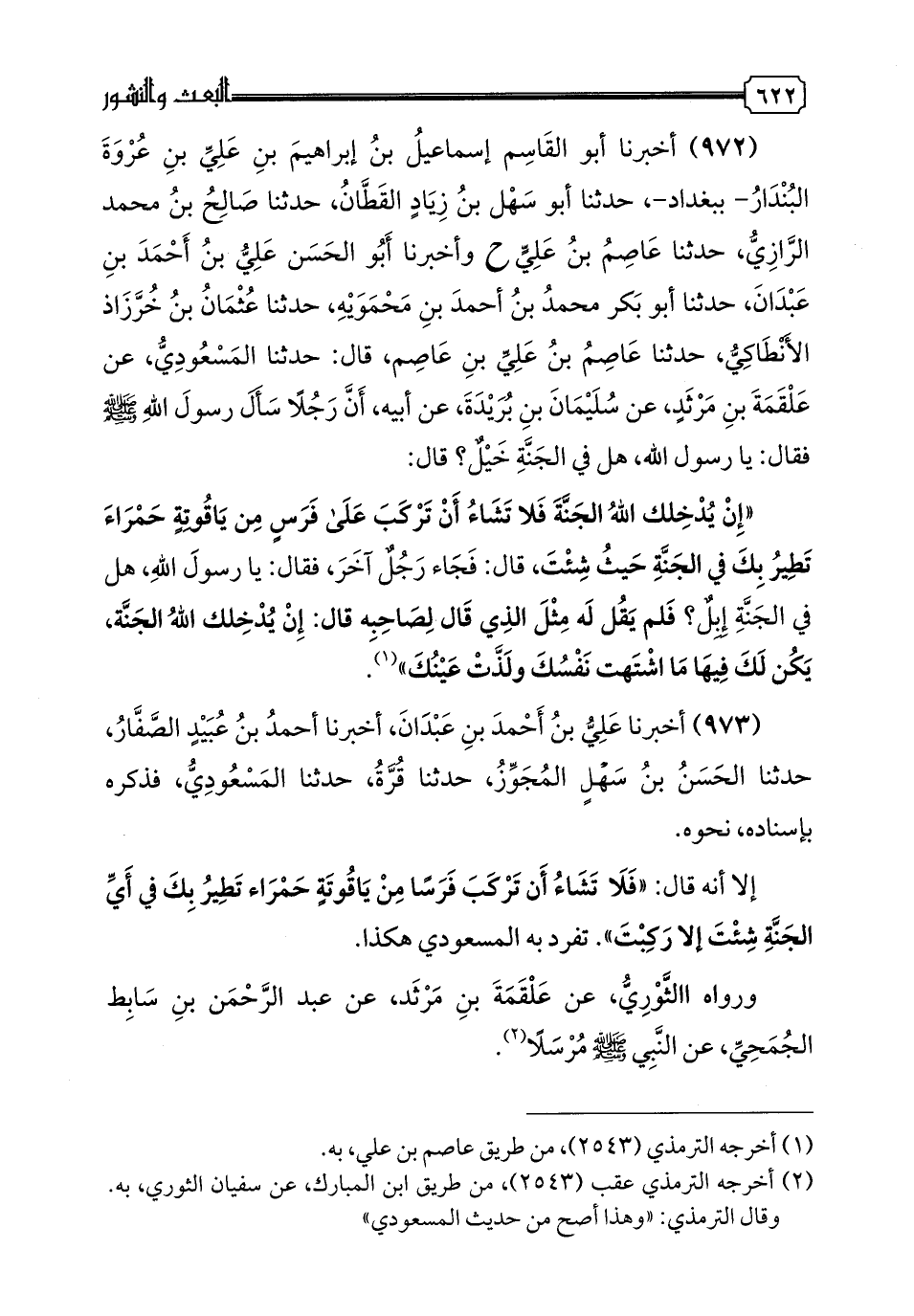 972 - أَخْبَرَنَا أَبُو الْقَاسِمِ إِسْمَاعِيلُ بْنُ إِبْرَاهِيمَ بْنِ عَلِيِّ بْنِ عُرْوَةَ الْبُنْدَارُ -بِبَغْدَادَ-، حدثنا أَبُو سَهْلِ بْنُ زِيَادٍ الْقَطَّانُ، حدثنا صَالِحُ بْنُ مُحَمَّدٍ الرازي، حدثنا عَاصِمُ بْنُ عَلِيٍّ ح وَأَخْبَرَنَا أَبُو الْحَسَنِ عَلِيُّ بْنُ أَحْمَدَ بْنِ عَبْدَانَ، حدثنا أَبُو بَكْرِ مُحَمَّدِ بْنِ أَحْمَدَ بْنِ مَحْمَوَيْهِ، حدثنا عُثْمَانُ بْنُ خُرَّزَاذ الْأَنْطَاكِيُّ، حدثنا عَاصِمُ بْنُ عَلِيِّ بْنِ عَاصِمٍ، قَالَ: حدثنا الْمَسْعُودِيُّ، عَنْ عَلْقَمَةَ بْنِ مَرْثَدٍ، عَنْ سُلَيْمَانَ بْنِ بُرَيْدَةَ، عَنْ أَبِيهِ، أَنَّ رَجُلًا سَأَلَ رَسُولَ اللَّهِ صَلَّى اللهُ عَلَيْهِ وَسَلَّمَ فَقَالَ: يَا رَسُولَ اللَّهِ هَلْ فِي الْجَنَّةِ خَيْلٌ؟ قَالَ: «إِنْ يُدْخِلْكَ اللَّهُ الْجَنَّةَ فَلَا تَشَاءُ أَنْ تَرْكَبَ عَلَى فَرَسٍ مِنْ يَاقُوتَةٍ حَمْرَاءَ تَطِيرُ بِكَ فِي الْجَنَّةِ حَيْثُ شِئْتَ»، قَالَ: فَجَاءَ رَجُلٌ آخَرُ، فَقَالَ: يَا رَسُولَ اللَّهِ هَلْ فِي الْجَنَّةِ إِبِلٌ فَلَمْ يَقُلْ لَهُ مِثْلَ الَّذِي قَالَ لصَاحِبُهُ قَالَ: «إِنْ يُدْخِلْكَ اللَّهُ الْجَنَّةَ، يَكُونُ لَكَ فِيهَا مَا اشْتَهَتْ نَفْسُكَ وَلَذَّتْ عَيْنُكَ»
