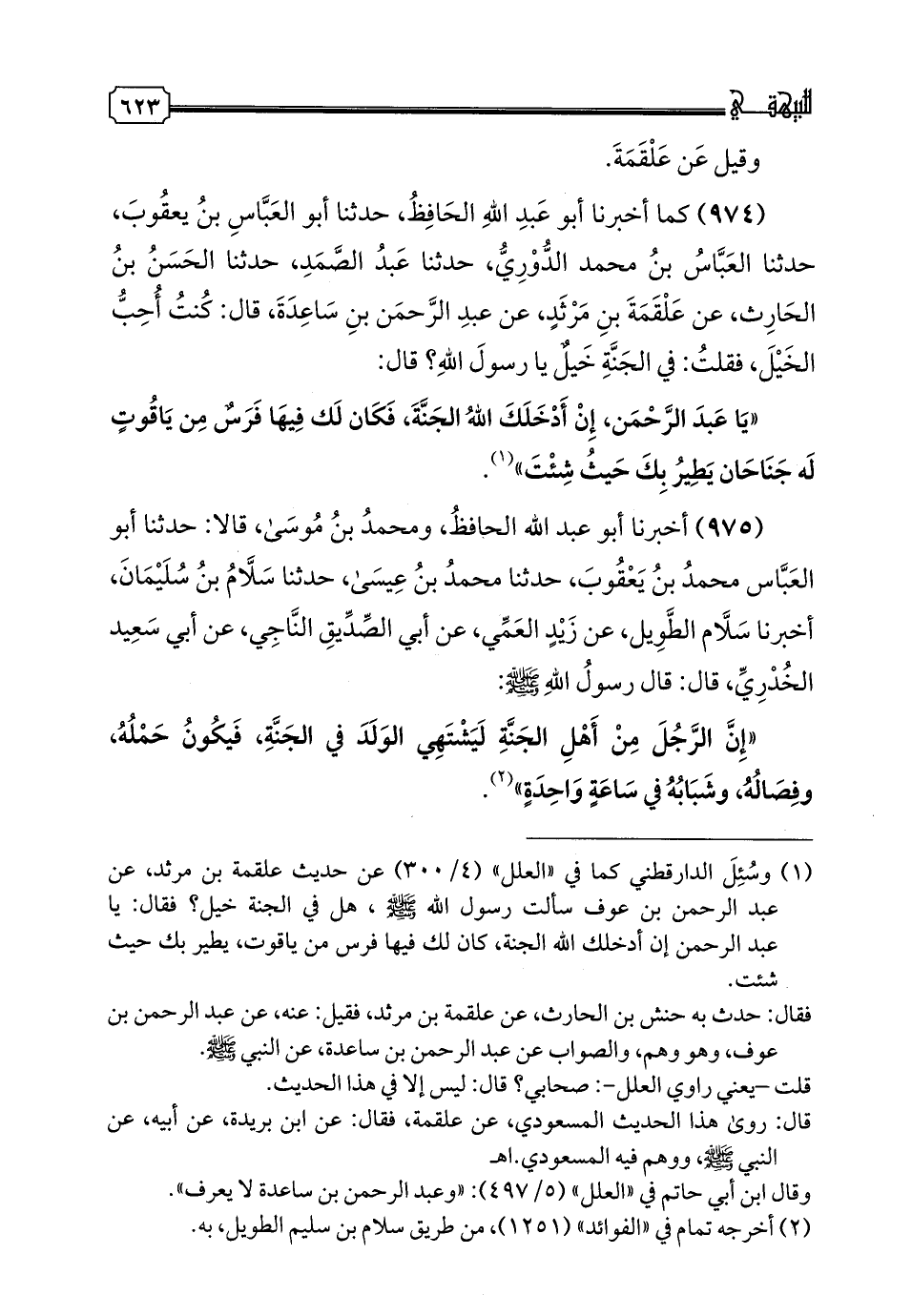 974 - كما أَخْبَرَنَا أَبُو عَبْدِ اللَّهِ الْحَافِظُ، حدثنا أَبُو الْعَبَّاسِ بْنُ يَعْقُوبَ، حدثنا الْعَبَّاسُ بْنُ مُحَمَّدٍ الدُّورِيُّ، حدثنا عَبْدُ الصَّمَدِ، حدثنا الْحَسَنُ بْنُ الْحَارِثِ، عَنْ عَلْقَمَةَ بْنِ مَرْثَدٍ، عَنْ عَبْدِ الرَّحْمَنِ بْنِ سَاعِدَةَ، قَالَ: " كُنْتُ أُحِبُّ الْخَيْلَ، فَقُلْتُ: فِي الْجَنَّةِ خَيْلٌ يَا رَسُولَ اللَّهِ؟ قَالَ: يَا عَبْدَ الرَّحْمَنِ إِنْ أَدْخَلَكَ اللَّهُ الْجَنَّةَ، فَكَانَ لَكَ فِيهَا فَرَسٌ مِنْ يَاقُوتٍ لَهُ جَنَاحَانِ يَطِيرُ بِكَ حَيْثُ شِئْتَ "