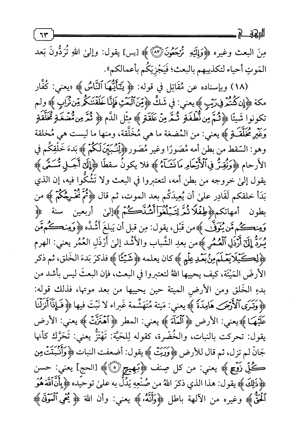 18 - وبإسناده عن مقاتل في قوله: {يأيها الناس} "يعني: كفار مكة {إن كنتم في ريب} يعني: في شك {من البعث فإنا خلقنكم من تراب} ولم تكونوا شيئا {ثم من نطفة ثم من علقة} مثل الدم {ثم من مضغة مخلقة وغير مخلقة} يعني: من المضغة ما هي مخلقة، ومنها ما ليست هي مخلقة وهو: السقط من بطن أمه مصورا وغير مصور {لنبين لكم} بدء خلقكم في الأرحام {ونقر في الأرحام ما نشاء} فلا يكون سقطا {إلى أجل مسمى} يقول إلى خروجه من بطن أمه لتعتبروا في البعث ولا تشكوا فيه، إن الذي بدأ خلقكم لقادر على أن يعيدكم بعد الموت، ثم قال {ثم نخرجكم} من بطون أمهاتكم {طفلا ثم لتبلغوا أشدكم} إلى أربعين سنة {ومنكم من يتوفى} من قبل، يقول: من قبل أن يبلغ أشده {ومنكم من يرد إلى أرذل العمر} من بعد الشباب والأشد إلى أرذل العمر يعني: الهرم {لكيلا يعلم من بعد علم} كان يعلمه {شيئا} فذكر بدء الخلق، ثم ذكر الأرض الميتة، كيف يحييها الله لتعتبروا في البعث، فإن البعث ليس بأشد من بدء الخلق ومن الأرض الميتة حين يحييها من بعد موتها، فذلك قوله: {وترى الأرض هامدة} يعني: ميتة متهشمة غبراء لا نبت فيها {فإذا أنزلنا عليها} يعني: الأرض {الماء} يعني: المطر {اهتزت} يعني: الأرض يقول: تحركت بالنبات، والخضرة، كقوله للحية: تهتز يعني: تحرك كأنها جان لم تزل، ثم قال للأرض {وربت} يقول: أضعفت النبات {وأنبتت من كل زوج} يعني: من كل صنف {بهيج} يعني: حسن {ذلك} يقول: هذا الذي ذكر الله من صنعه يدل به على توحيده {بأن الله هو الحق} وغيره من الآلهة باطل {وأنه} يعني: وأن الله {يحيى الموتى} في الآخرة {وأنه} يعني: وإن الله {على كل شيء} من البعث، وغيره {قدير (6) وأن الساعة ءاتية} يعني: جائية كائنة {وأن الله يبعث من في القبور} في الآخرة من الأموات، فلا يشكوا في البعث".