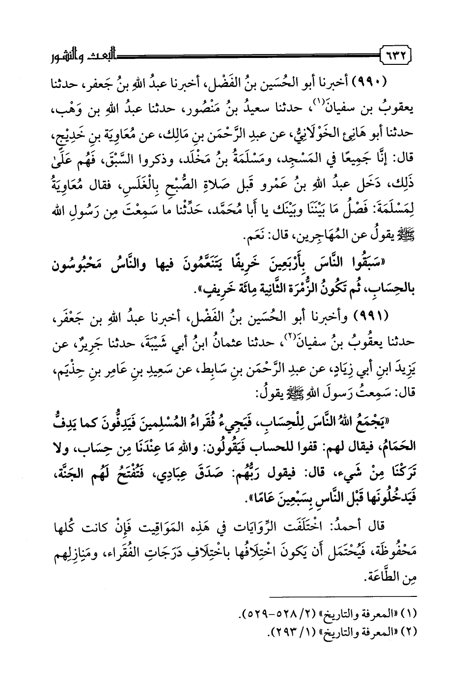 990 - أَخْبَرَنَا أَبُو الْحُسَيْنِ بْنُ الْفَضْلِ، أخبرنا عَبْدُ اللَّهِ بْنُ جَعْفَرٍ، حدثنا يَعْقُوبُ بْنُ سُفْيَانَ، حدثنا سَعِيدُ بْنُ مَنْصُورٍ، حدثنا عَبْدُ اللَّهِ بْنُ وَهْبٍ، حدثنا أَبُو هَانِئٍ الْخَوْلَانِيُّ، عَنْ عَبْدِ الرَّحْمَنِ بْنِ مَالِكٍ، عَنْ مُعَاوِيَةَ بْنِ خَدِيجٍ، قَالَ: إنَّا جَمِيعًا فِي الْمَسْجِدِ، وَمَسْلَمَةُ بْنُ مُخَلَّدٍ، وَذَكَرَ السَّبْقَ فَهُمْ عَلَى ذَلِكَ، دَخَلَ عَبْدُ اللَّهِ بْنُ عَمْرٍو قَبْلَ صَلَاةِ الصُّبْحِ بِالْغَلَسِ، فَقَالَ مُعَاوِيَةُ لِمَسْلَمَةَ: فَصْلُ مَا بَيْنَنَا وَبَيْنَكَ يَا أَبَا مُحَمَّدٍ، حَدِّثْنَا مَا سَمِعْتَ مِنْ رَسُولِ اللَّهِ صَلَّى اللهُ عَلَيْهِ وَسَلَّمَ يَقُولُ عَنِ الْمُهَاجِرِينَ، قَالَ: نَعَمْ «سَبَقُوا النَّاسَ بِأَرْبَعِينَ خَرِيفًا يَتَنَعَّمُونَ فِيهَا، وَالنَّاسُ مَحْبُوسُونَ بِالْحِسَابِ، ثُمَّ تَكُونُ الزُّمْرَةُ الثَّانِيَةُ مِائَةَ خَرِيفٍ»
