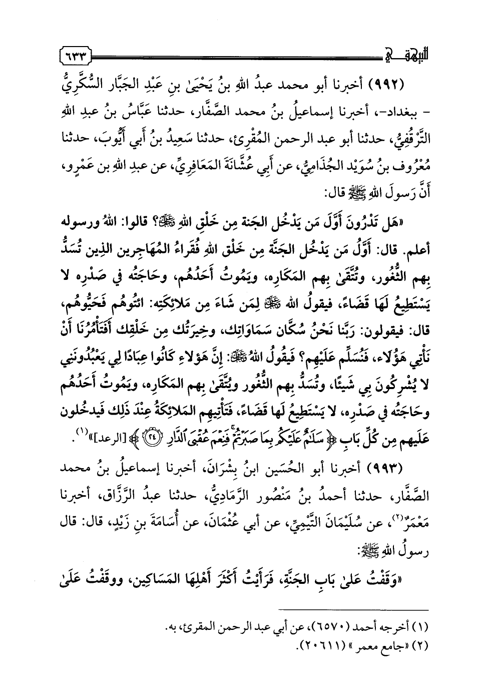992 - أَخْبَرَنَا أَبُو مُحَمَّدٍ عَبْدُ اللَّهِ بْنُ يَحْيَى بْنِ عَبْدِ الْجَبَّارِ السُّكَّرِيُّ، -بِبَغْدَادَ-، أخبرنا إِسْمَاعِيلُ بْنُ مُحَمَّدٍ الصَّفَّارُ، حدثنا عَبَّاسُ بْنُ عَبْدِ اللَّهِ التَّرْقُفِيُّ، حدثنا أَبُو عَبْدِ الرَّحْمَنِ الْمُقْرِئُ، حدثنا سَعِيدُ بْنُ أَبِي أَيُّوبَ، حدثنا مَعْرُوفُ بْنُ سُوَيْدٍ الْجُذَامِيُّ، عَنْ أَبِي عُشَّانَةَ الْمَعَافِرِيِّ، عَنْ عَبْدِ اللَّهِ بْنِ عَمْرٍو، أَنَّ رَسُولَ اللَّهِ صَلَّى اللهُ عَلَيْهِ وَسَلَّمَ قَالَ: " هَلْ تَدْرُونَ أَوَّلَ مَنْ يَدْخُلُ الْجَنَّةَ مِنْ خَلْقِ اللَّهِ عَزَّ وَجَلَّ؟ قَالُوا اللَّهُ وَرَسُولُهُ أَعْلَمُ. قَالَ: " أَوَّلُ مَنْ يَدْخُلُ الْجَنَّةَ مِنْ خَلْقِ اللَّهِ فُقَرَاءُ الْمُهَاجِرِينَ الَّذِينَ تُسَدُّ بِهِمُ الثُّغُورُ، وَتُتَّقَى بِهِمُ الْمَكَارِهُ، وَيَمُوتُ أَحَدُهُمْ، وَحَاجَتُهُ فِي صَدْرِهِ لَا يَسْتَطِيعُ لَهَا قَضَاءً، فَيَقُولُ اللَّهُ عَزَّ وَجَلَّ لِمَنْ شَاءَ مِنْ مَلَائِكَتِهِ: ائتُوهُمْ فَحَيُّوهُمْ، قَالَ: فَيَقُولُونَ: رَبَّنَا نَحْنُ سُكَّانُ سَمَاوَاتِكَ، وَخِيرَتُكَ مِنْ خَلْقِكَ أَفَتَأمُرُنَا أَنْ نَأتِيَ هَؤُلَاءِ، فَنُسَلِّمَ عَلَيْهِمْ؟ فَيَقُولُ اللَّهُ عَزَّ وَجَلَّ: إِنَّ هَؤُلَاءِ كَانُوا عِبَادًا لِي يَعْبُدُونَنِي لَا يُشْرِكُونَ بِي شَيْئًا، وَتُسَدُّ بِهِمُ الثُّغُورُ وَيُتَّقَى بِهِمُ الْمَكَارِهُ، وَيَمُوتُ أَحَدُهُمْ وَحَاجَتُهُ فِي صَدْرِهِ، لَا يَسْتَطِيعُ لَهَا قَضَاءً، فَتَأتِيهِمُ الْمَلَائِكَةُ عِنْدَ ذَلِكَ فَيَدْخُلُونَ عَلَيْهِمْ مِنْ كُلِّ بَابٍ {سَلَامٌ عَلَيْكُمْ بِمَا صَبَرْتُمْ، فَنِعْمَ عُقْبَى الدَّارِ} "