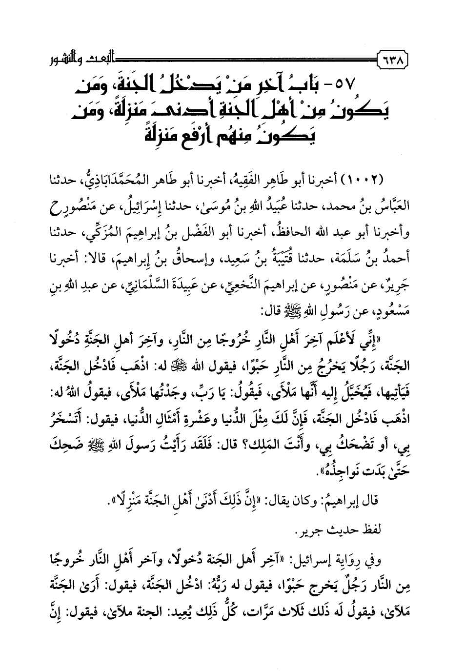وَأَخْبَرَنَا أَبُو عَبْدِ اللَّهِ الْحَافِظُ، أخبرنا أَبُو الْفَضْلِ بْنُ إِبْرَاهِيمَ الْمُزَكِّي، حدثنا أَحْمَدُ بْنُ سَلَمَةَ، حدثنا قُتَيْبَةُ بْنُ سَعِيدٍ، وَإِسْحَاقُ بْنُ إِبْرَاهِيمَ، قَالَا: أخبرنا جَرِيرٌ، عَنْ مَنْصُورٍ، عَنْ إِبْرَاهِيمَ النَّخَعِيِّ، عَنْ عَبِيدَةَ السَّلْمَانِيِّ، عَنْ عَبْدِ اللَّهِ بْنِ مَسْعُودٍ، عَنْ رَسُولِ اللَّهِ صَلَّى اللهُ عَلَيْهِ وَسَلَّمَ قَالَ: " إِنِّي لَأَعْلَمُ آخِرَ أَهْلِ النَّارِ خُرُوجًا مِنَ النَّارِ، وَآخَرَ أَهْلِ الْجَنَّةِ دُخُولًا الْجَنَّةَ، رَجُلًا يَخْرُجُ مِنَ النَّارِ حَبْواً، فَيَقُولُ اللَّهُ عَزَّ وَجَلَّ لَهُ: اذْهَبْ فَادْخُلِ الْجَنَّةَ، فَيَأتِيهَا فَيُخَيَّلُ إِلَيْهِ أَنَّهَا مَلأى، فَيَقُولُ يَا رَبِّ وَجَدْتُهَا مَلأى، فَيَقُولُ اللَّهُ لَهُ: اذْهَبْ فَادْخُلِ الْجَنَّةَ، فَإِنَّ لَكَ مِثْلَ الدُّنْيَا وَعَشَرَةَ أَمْثَالِ الدُّنْيَا، فَيَقُولُ: أَتَسْخَرُ بِي أَوْ تَضْحَكُ بِي، وَأَنْتَ الْمَلِكُ، قَالَ: فَلَقَدْ رَأَيْتُ رَسُولَ اللَّهِ صَلَّى اللهُ عَلَيْهِ وَسَلَّمَ ضَحِكَ حَتَّى بَدَتْ نَوَاجِذُهُ ".