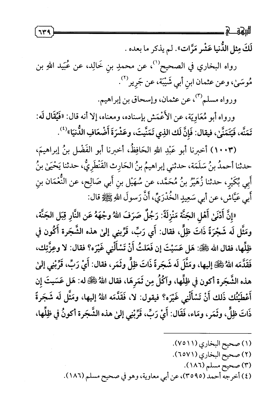 1003 - أَخْبَرَنَا عَبْدُ اللَّهِ الْحَافِظُ، أخبرنا أَبُو الْفَضْلِ بْنُ إِبْرَاهِيمَ، حدثنا أَحْمَدُ بْنُ سَلَمَةَ، حَدَّثَنِي إِبْرَاهِيمُ بْنُ الْحَارِثِ الْقَنْطَرِيُّ، حدثنا يَحْيَى بْنُ أَبِي بُكَيْرٍ، حدثنا زُهَيْرُ بْنُ مُحَمَّدٍ، عَنْ سَهْيلِ بْنِ أَبِي صَالِحٍ، عَنِ النُّعْمَانِ بْنِ أَبِي عَيَّاشٍ، عَنْ أَبِي سَعِيدٍ الْخُدْرِيِّ، أَنَّ رَسُولَ اللَّهِ صَلَّى اللهُ عَلَيْهِ وَسَلَّمَ قَالَ: " إِنَّ أَدْنَى أَهْلِ الْجَنَّةِ مَنْزِلَةً رَجُلٌ صَرَفَ اللَّهُ وَجْهَهُ عَنِ النَّارِ قِبَلَ الْجَنَّةِ، وَمثَّل لَهُ شَجَرَةٌ ذَاتُ ظِلٍّ، فَقَالَ: أَيْ رَبِّ قَرِّبْنِي إِلَى هَذِهِ الشَّجَرَةِ أَكُونُ فِي ظِلِّهَا، فَقَالَ اللَّهُ عَزَّ وَجَلَّ: هَلْ عَسَيْتَ إِنْ فَعَلْتُ أَنْ تَسْأَلَنِي غَيْرَهُ؟ فَقَالَ: لَا وَعِزَّتِكَ، فَقَدَّمَهُ اللَّهُ عَزَّ وَجَلَّ إِلَيْهَا، وَمُثِّلَ لَهُ شَجَرَةٌ ذَاتُ ظِلٍّ وَثَمَرٍ، فَقَالَ: أَيْ رَبِّ قَرِّبْنِي إِلَى هَذِهِ الشَّجَرَةِ أَكُونُ فِي ظِلِّهَا، وَآكُلُ مِنْ ثَمَرِهَا، فَقَالَ اللَّهُ عَزَّ وَجَلَّ لَهُ: هَلْ عَسَيْتَ إِنْ أَعْطَيْتُكَ ذَلِكَ أَنْ تَسْأَلَنِي غَيْرَهُ، فَيَقُولُ: لَا، فَقَدَّمَهُ اللَّهُ إِلَيْهَا، وَمُثِّلَ لَهُ شَجَرَةٌ ذَاتُ ظِلٍّ وَثَمَرٍ وماء، فَقَالَ: أَيْ رَبِّ قَرِّبْنِي إِلَى هَذِهِ الشَّجَرَةِ أَكُونُ فِي ظِلِّهَا، وَآكُلُ مِنْ ثَمَرِهَا، وَأَشْرَبُ مِنْ مَائِهَا، فَيَقُولُ اللَّهُ عَزَّ وَجَلَّ: هَلْ عَسَيْتَ إِنْ فَعَلْتُ أَنْ تَسْأَلَنِي غَيْرَهُ؟ فَيَقُولُ: لَا وَعِزَّتِكَ، لَا أَسْأَلُكُ غَيْرَهُ، فَيُقَدِّمُهُ اللَّهُ إِلَيْهَا، فَبَرَزَ لَهُ بَابُ الْجَنَّةِ، فَيَقُولُ: أَيْ رَبِّ قَرِّبْنِي إِلَى بَابِ الْجَنَّةِ، فَأَنْظُرَ إِلَى أَهْلِهَا، فَيُقَدِّمُهُ اللَّهُ إِلَيْهَا فَيَرَى أهل الْجَنَّةَ وَمَا فِيهَا، فَيَقُولُ: أَيْ رَبِّ أَدْخِلْنِي الْجَنَّةَ، قَالَ: فَيُدْخِلُهُ اللَّهُ الْجَنَّةَ، فَإِذَا دَخَلَ الْجَنَّةَ، قَالَ: هَذَا لِي! فَيَقُولُ اللَّهُ عَزَّ وَجَلَّ تَمَنَّ، قَالَ: فَيَتَمَنَّى وَيُذَكِّرُهُ اللَّهُ، تَمَنَّ كَذَا وَكَذَا، حَتَّى إِذَا انْقَطَعَتْ بِهِ الْأَمَانِيُّ، قَالَ اللَّهُ عَزَّ وَجَلَّ: هُوَ لَكَ وَعَشَرَةُ أَمْثَالِهِ، قَالَ: ثُمَّ يَدْخُلُ الْجَنَّةَ، فَيَدْخُلُ عَلَيْهِ زَوْجَتَاهُ مِنَ الْحُورِ الْعَيْنِ، فَيَقُولان لَهُ: الْحَمْدُ لِلَّهِ الَّذِي أَحْيَاكَ لَنَا، وَأَحْيَانَا لَكَ، قَالَ: فَيَقُولُ: مَا أُعْطِيَ أَحَدٌ مِثْلَ مَا أُعْطِيتُ، قَالَ: وَأَدْنَى أَهْلِ النَّارِ عَذَابًا يُنْعَلُ بِنَعْلَيْنِ مِنْ نَارٍ يَغْلِي دِمَاغُهُ مِنْ حَرَارَةِ نَعْلَيْهِ "