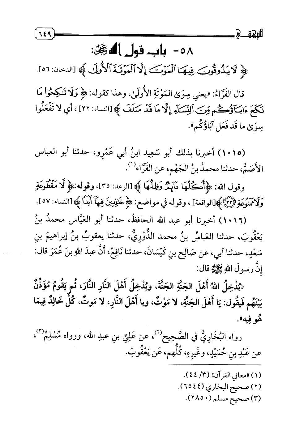 1016 - أَخْبَرَنَا أَبُو عَبْدِ اللَّهِ الْحَافِظُ، حدثنا أَبُو الْعَبَّاسِ مُحَمَّدُ بْنُ يَعْقُوبَ، حدثنا الْعَبَّاسُ بْنُ مُحَمَّدٍ الدُّورِيُّ، حدثنا يَعْقُوبُ بْنُ إِبْرَاهِيمَ بْنِ سَعْدٍ، حدثنا أَبِي، عَنْ صَالِحِ بْنِ كَيْسَانَ، حدثنا نَافِعٌ، أَنَّ عَبْدَ اللَّهِ بْنَ عُمَرَ قَالَ: إِنَّ رَسُولَ اللَّهِ صَلَّى اللهُ عَلَيْهِ وَسَلَّمَ قَالَ: " يُدْخِلُ اللَّهُ أَهْلَ الْجَنَّةِ الْجَنَّةَ، وَيُدْخِلُ أَهْلَ النَّارِ النَّارَ، ثُمَّ يَقُومُ مُؤَذِّنٌ بَيْنَهُمْ فَيَقُولُ: يَا أَهْلَ الْجَنَّةِ لَا مَوْتَ، وَيَا أَهْلَ النَّارِ لَا مَوْتَ، كُلٌّ خَالِدٌ فِيمَا هُوَ فِيهِ ".