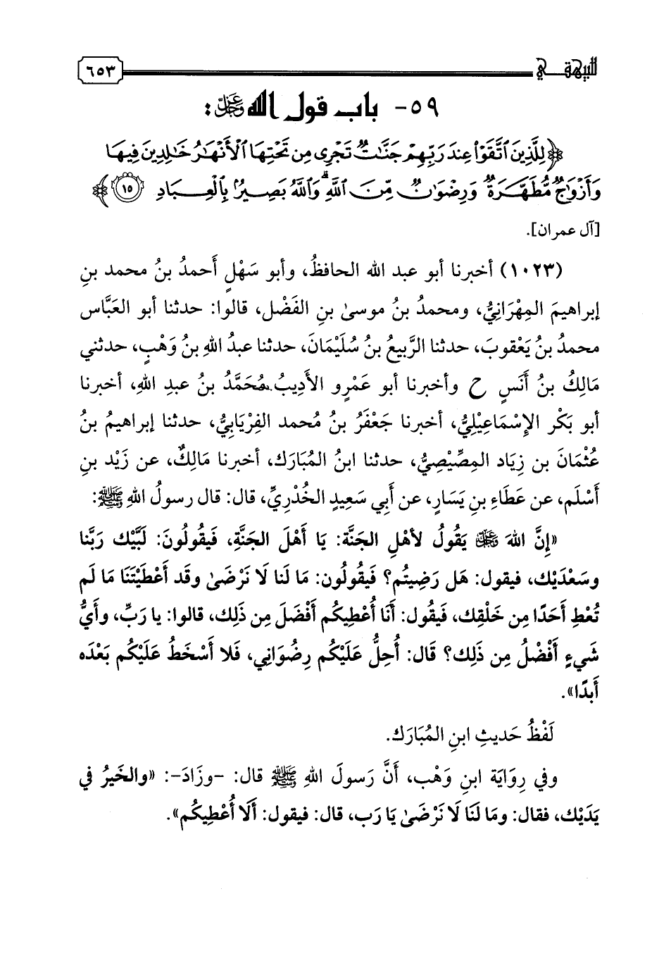 وَأَخْبَرَنَا أَبُو عَمْرٍو الْأَدِيبُ مُحَمَّدُ بْنُ عَبْدِ اللَّهِ، أخبرنا أَبُو بَكْرٍ الْإِسْمَاعِيلِيُّ، أخبرنا جَعْفَرُ بْنُ مُحَمَّدٍ الْفِرْيَابِيُّ، حدثنا إِبْرَاهِيمُ بْنُ عُثْمَانَ بْنِ زِيَادٍ الْمِصِّيصِيُّ، حدثنا ابْنُ الْمُبَارَكِ، أخبرنا مَالِكٌ، عَنْ زَيْدِ بْنِ أَسْلَمَ، عَنْ عَطَاءِ بْنِ يَسَارٍ، عَنْ أَبِي سَعِيدٍ الْخُدْرِيِّ، قَالَ: قَالَ رَسُولُ اللَّهِ صَلَّى اللهُ عَلَيْهِ وَسَلَّمَ: " إِنَّ اللَّهَ عَزَّ وَجَلَّ يَقُولُ لِأَهْلِ الْجَنَّةِ: يَا أَهْلَ الْجَنَّةِ، فَيَقُولُونَ: لَبَّيْكَ رَبَّنَا وَسَعْدَيْكَ، فَيَقُولُ: هَلْ رَضِيتُمْ؟ فَيَقُولُونَ: مَا لَنَا لَا نَرْضَى وَقَدْ أَعْطَيْتَنَا مَا لَمْ تعْطَ أَحَدا مِنْ خَلْقِكَ، فَيَقُولُ: أَنَا أَعْطَيْكُمْ أَفْضَلَ مِنْ ذَلِكَ، قَالُوا: يَا رَبُّ، وَأي شيء أَفْضَلُ مِنْ ذَلِكَ؟ قَالَ: أُحِلُّ عَلَيْكُمْ رِضْوَانِي، فَلَا أَسْخَطُ عَلَيْكُمْ بَعْدَهُ أَبَدًا " لَفْظُ حَدِيثِ ابْنِ الْمُبَارَكِ، وَفِي رِوَايَةِ ابْنِ وَهْبٍ، أنَّ رَسُولَ اللَّهِ صَلَّى اللهُ عَلَيْهِ وَسَلَّمَ قَالَ: -وَزَاد-: "وَالْخَيْرُ فِي يَدَيْكَ، فَقَالَ: وَمَا لَنَا لَا نَرْضَى يَا رَبُّ، قَالَ: فَيَقُولُ: أَلَا أُعْطِيكُمْ".