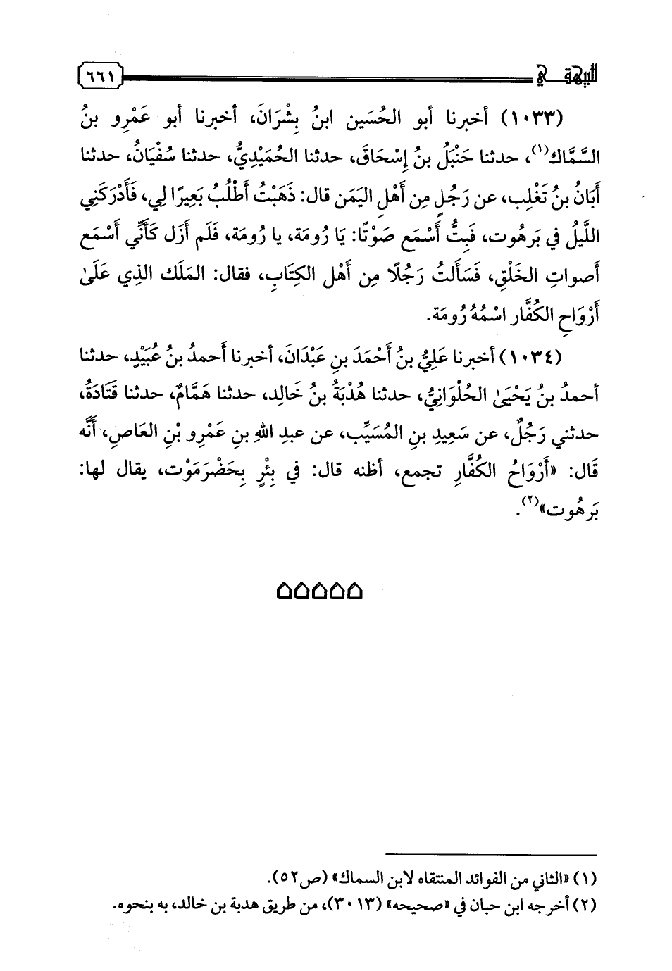 1034 - أَخْبَرَنَا عَلِيُّ بْنُ أَحْمَدَ بْنِ عَبْدَانَ، أخبرنا أَحْمَدُ بْنُ عُبَيْدٍ، حدثنا أَحْمَدُ بْنُ يَحْيَى الْحُلْوَانِيُّ، حدثنا هُدْبَةُ بْنُ خَالِدٍ، حدثنا هَمَّامٌ، حدثنا قَتَادَةُ، حَدَّثَنِي رَجُلٌ، عَنْ سَعِيدِ بْنِ الْمُسَيِّبِ، عَنْ عَبْدِ اللَّهِ بْنِ عَمْرِو بْنِ الْعَاصِ، أَنَّهُ قَالَ: " أَرْوَاحُ الْكُفَّارِ تُجْمَعُ، أَظُنُّهُ قَالَ: فِي بِئْرٍ بِحَضْرَمَوْتَ، يُقَالُ لَهَا: برهوت".