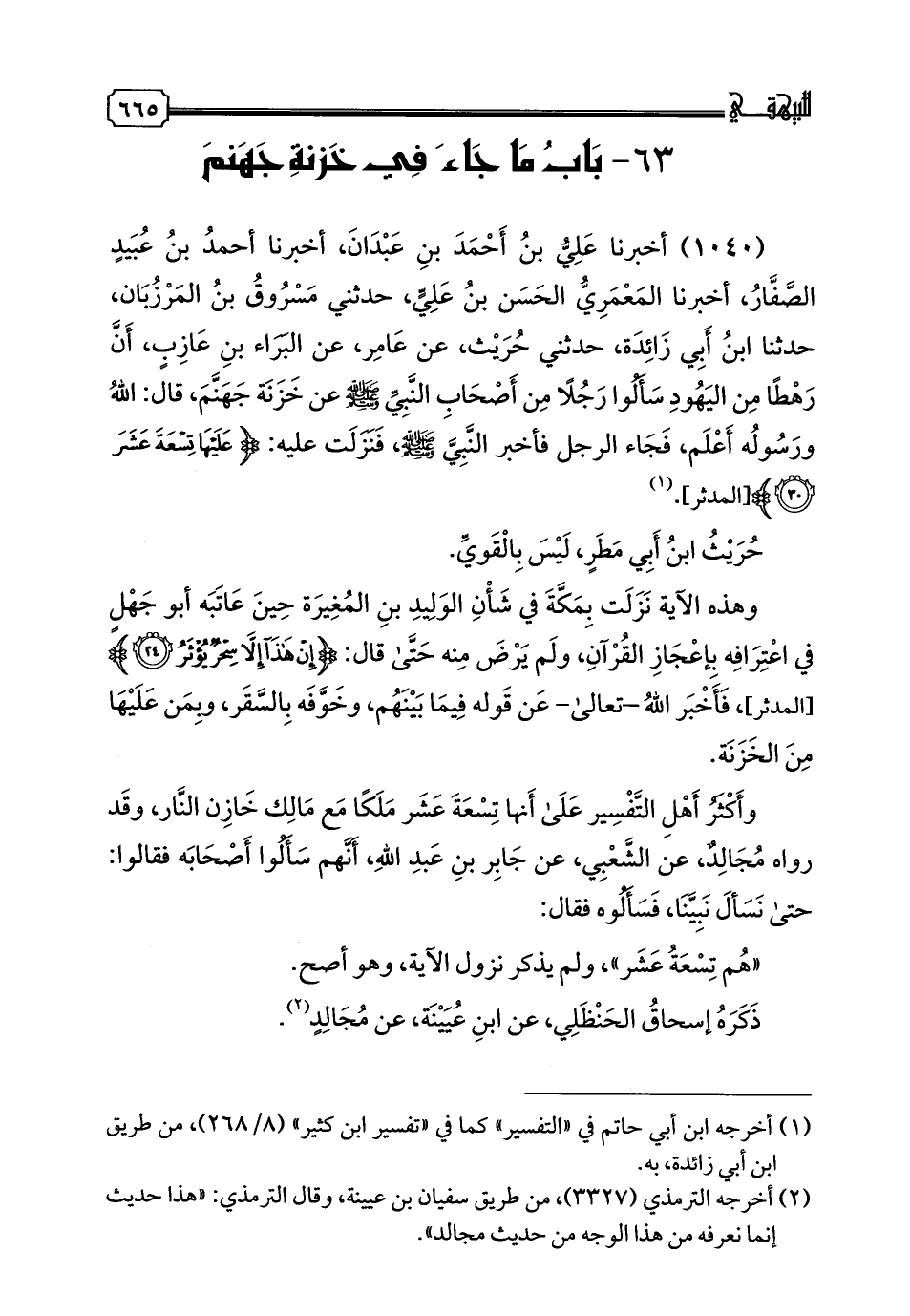 1040 - أَخْبَرَنَا عَلِيُّ بْنُ أَحْمَدَ بْنِ عَبْدَانَ، أخبرنا أَحْمَدُ بْنُ عُبَيْدٍ الصَّفَّارُ، أخبرنا الْمَعْمَرِيُّ الْحَسَنُ بْنُ عَلِيٍّ، حَدَّثَنِي مَسْرُوقُ بْنُ الْمَرْزُبَانِ، حدثنا ابْنُ أَبِي زَائِدَةَ، حَدَّثَنِي حُرَيْثٌ، عَنْ عَامِرٍ، عَنِ الْبَرَاءِ بْنِ عَازِبٍ أَنَّ رَهْطًا مِنَ الْيَهُودِ سَأَلُوا رَجُلًا مِنْ أَصْحَابِ النَّبِيِّ صَلَّى اللهُ عَلَيْهِ وَسَلَّمَ عَنْ خَزَنَةِ جَهَنَّمَ، قَالَ: اللَّهُ وَرَسُولُهُ أَعْلَمُ، فَجَاءَ الرَّجُلُ فَأَخْبَرَ النَّبِيَّ صَلَّى اللهُ عَلَيْهِ وَسَلَّمَ، فَنَزَلَتْ عَلَيْهِ: {عَلَيْهَا تِسْعَةَ عَشَرَ} حَريثُ ابْنِ أَبِي مَطَرٍ لَيْسَ بِالْقَوِيِّ.