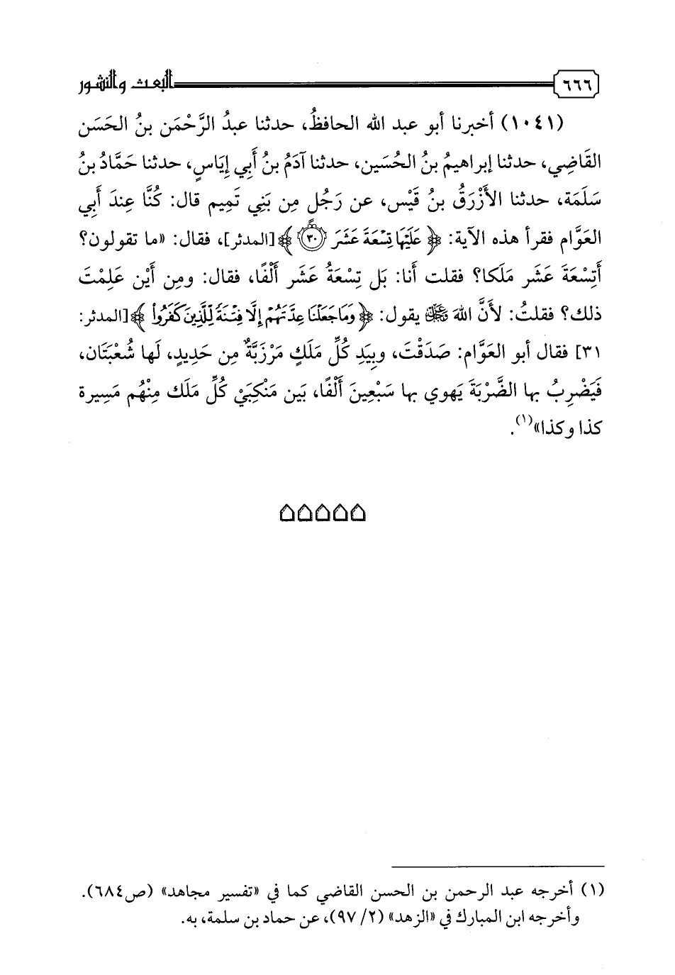 1041 - أَخْبَرَنَا أَبُو عَبْدِ اللَّهِ الْحَافِظُ، حدثنا عَبْدُ الرَّحْمَنِ بْنُ الْحَسَنِ الْقَاضِي، حدثنا إِبْرَاهِيمُ بْنُ الْحُسَيْنِ، حدثنا آدَمُ بْنُ أَبِي أيَاسَ، حدثنا حَمَّادُ بْنُ سَلَمَةَ، حدثنا الْأَزْرَقُ بْنُ قَيْسٍ، عَنْ رَجُلٍ مِنْ بَنِي تَمِيمٍ قَالَ: كُنَّا عِنْدَ أَبِي الْعَوَّامِ فَقَرَأَ هَذِهِ الْآيَةَ: {عَلَيْهَا تِسْعَةَ عَشَرَ}، فَقَالَ: مَا تَقُولُونَ؟ أَتِسْعَةَ عَشَرَ مَلَكًا؟ فَقُلْتُ أَنَا: بَلْ تِسْعَةَ عَشَرَ أَلْفًا، فَقَالَ: وَمِنْ أَيْنَ عَلِمْتَ ذَلِكَ؟ فَقُلْتُ: لِأَنَّ اللَّهَ عَزَّ وَجَلَّ يَقُولُ: {وَمَا جَعَلْنَا عِدَّتَهُمْ إِلَّا فِتْنَةً لِلَّذِينَ كَفَرُوا}، فَقَالَ أَبُو الْعَوَّامِ: صَدَقْتَ، وَبِيَدِ كُلِّ مَلَكٍ مِرْزَبَّةٌ مِنْ حَدِيدٍ لَهَا شُعْبَتَانِ، فَيَضْرِبُ بِهَا الضَّرْبَةَ يَهْوِي بِهَا سَبْعِينَ أَلْفًا، بَيْنَ مَنْكِبَيْ كُلِّ مَلَكٍ مِنْهُمْ مَسِيرَةُ كَذَا وَكَذَا
