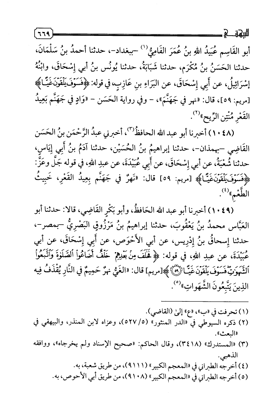 1049 - أَخْبَرَنَا أَبُو عَبْدِ اللَّهِ الْحَافِظُ، وَأَبُو بَكْرٍ الْقَاضِي، قَالَا: حدثنا أَبُو الْعَبَّاسِ مُحَمَّدُ بْنُ يَعْقُوبَ، حدثنا إِبْرَاهِيمُ بْنُ مَرْزُوقٍ الْبَصْرِيُّ، -بِمِصْرَ-، حدثنا إِسْحَاقُ بْنُ إِدْرِيسَ، عَنْ أَبِي الْأَحْوَصِ، عَنْ أَبِي إِسْحَاقَ، عَنْ أَبِي عُبَيْدَةَ، عَنْ عَبْدِ اللَّهِ، فِي قَوْلِهِ: {فَخَلَفَ مِنْ بَعْدِهِمْ خَلْفٌ أَضَاعُوا الصَّلَاةَ وَاتَّبَعُوا الشَّهَوَاتِ فَسَوْفَ يَلْقَوْنَ غَيًّا}، قَالَ: الْغَيُّ نَهَرُ حَمِيمٍ فِي النَّارِ يُقْذَفُ فِيهِ الَّذِينَ يَتَّبِعُونَ الشَّهَوَاتِ "
