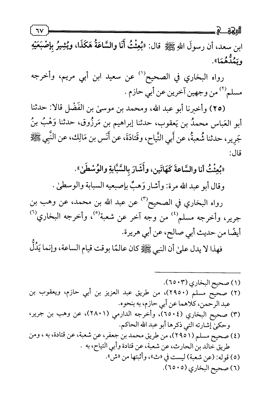 25 - وأخبرنا أبو عبد الله، ومحمد بن موسى بن الفضل قالا: حدثنا أبو العباس محمد بن يعقوب، حدثنا إبراهيم بن مرزوق، حدثنا وهب بن جرير، حدثنا شعبة، عن أبي التياح، وقتادة، عن أنس بن مالك، عن النبي صلى الله عليه وسلم قال: "بعثت أنا والساعة كهاتين، وأشار بالسبابة والوسطى".