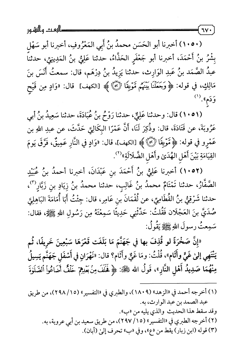 1051 - قَالَ: وحدثنا عَلِيٌّ، حدثنا رَوْحُ بْنُ عُبَادَةَ، حدثنا سَعِيدُ بْنُ أَبِي عَرُوبَةَ، عَنْ قَتَادَةَ، قَالَ: وذُكِرَ لَنَا، أَنَّ عمرا الْبِكَالِيَّ حَدَّثَ، عَنْ عَبْدِ اللَّهِ بْنِ عَمْرٍو فِي قَوْلِهِ: {مَوْبِقًا}، قَالَ: «وَادٍ فِي النَّارِ عَمِيقٌ، فَرْقٌ يَوْمَ الْقِيَامَةِ بَيْنَ أَهْلِ الْهُدَى وَأَهْلِ الضَّلَالَةِ».