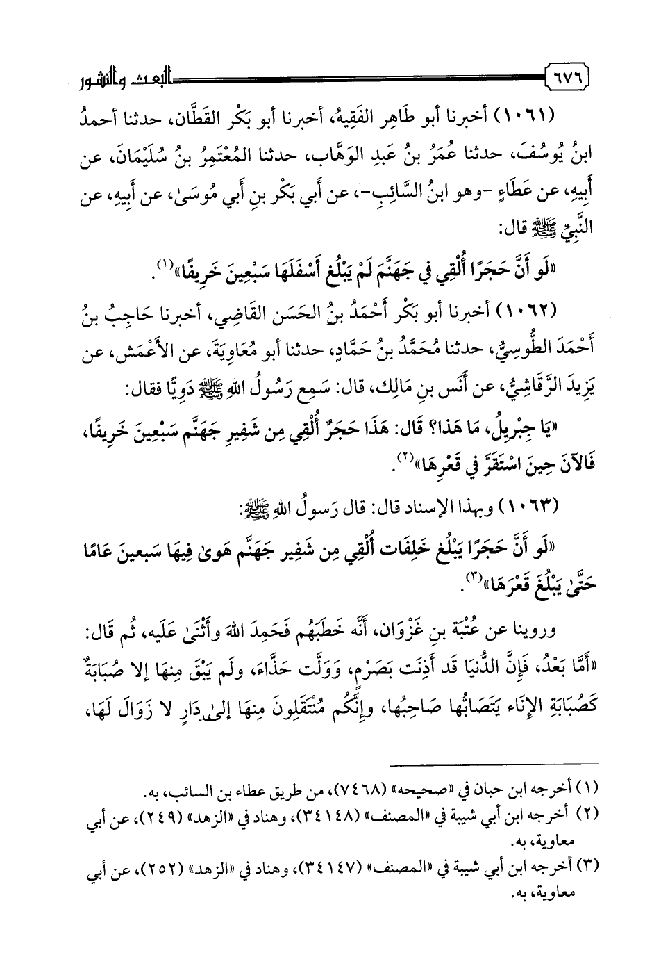 1063 - وَبِهَذَا الْإِسْنَادِ قَالَ: قَالَ رَسُولُ اللَّهِ صَلَّى اللهُ عَلَيْهِ وَسَلَّمَ: «لَوْ أَنَّ حَجَرًا يَبْلُغُ خَلِفَاتٍ أُلْقِيَ مِنْ شَفِيرِ جَهَنَّمَ هَوَى فِيهَا سَبْعِينَ عَامًا حَتَّى يَبْلُغَ قَعْرَهَا»