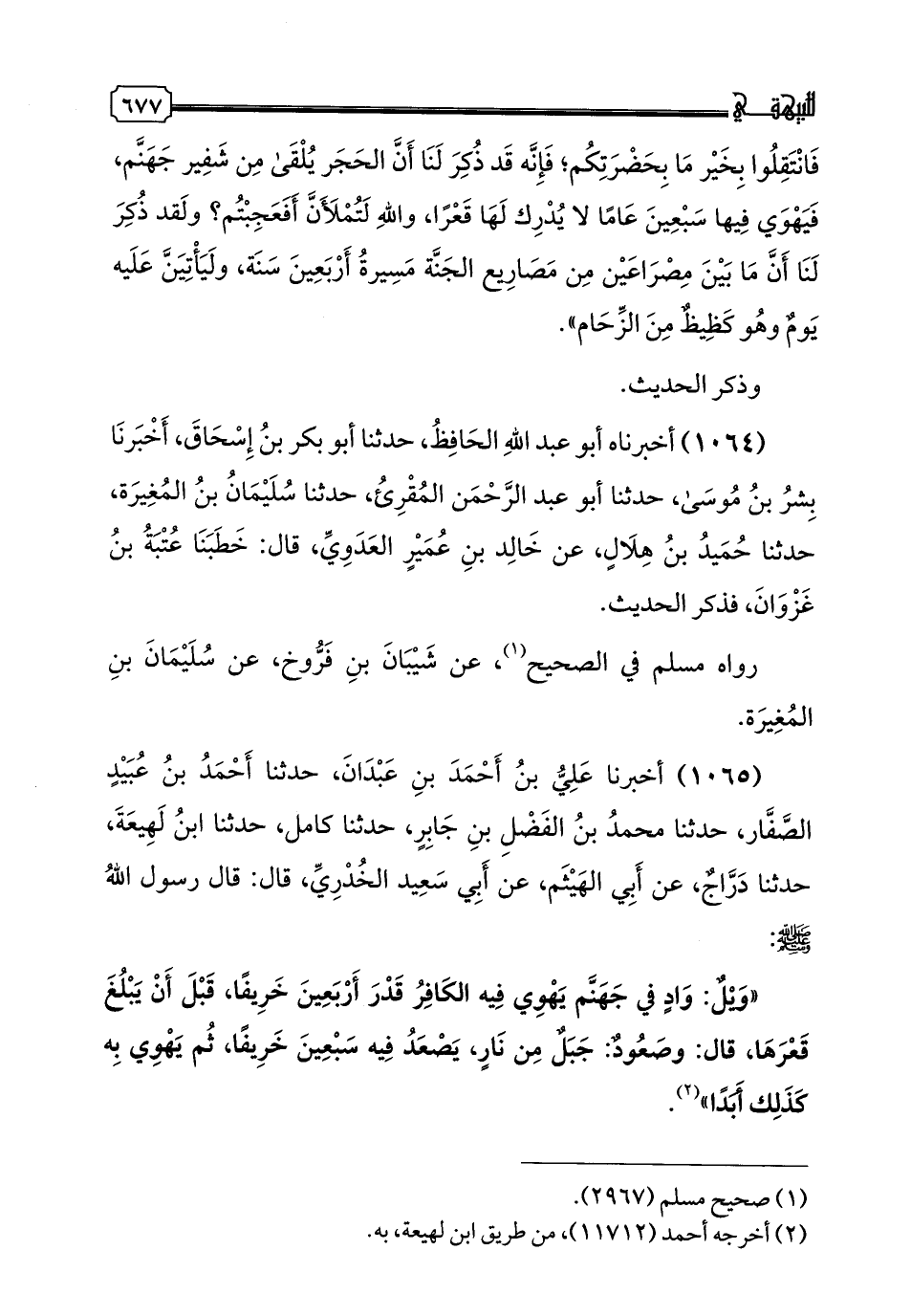1065 - أَخْبَرَنَا عَلِيُّ بْنُ أَحْمَدَ بْنِ عَبْدَانَ، حدثنا أَحْمَدُ بْنُ عُبَيْدٍ الصَّفَّارُ، حدثنا مُحَمَّدُ بْنُ الْفَضْلِ بْنِ حَازِمٍ، حَدَّثَنَا كَامِلٌ، حدثنا ابْنُ لَهِيعَةَ، حدثنا دَرَّاجٌ، عَنْ أَبِي الْهَيْثَمِ، عَنْ أَبِي سَعِيدٍ الْخُدْرِيِّ، قَالَ: قَالَ رَسُولُ اللَّهِ صَلَّى اللهُ عَلَيْهِ وَسَلَّمَ: «وَيْلٌ وَادِي فِي جَهَنَّمَ يَهْوِي فِيهِ الْكَافِرُ قَدْرَ أَرْبَعِينَ خَرِيفًا، قبل أن يبلغ قعرها قال: وصَعودٌ: جبل من نار يصعد فيه سبعين خريفا ثُمَّ يَهْوِي بِهِ كَذَلِكَ أَبَدًا».