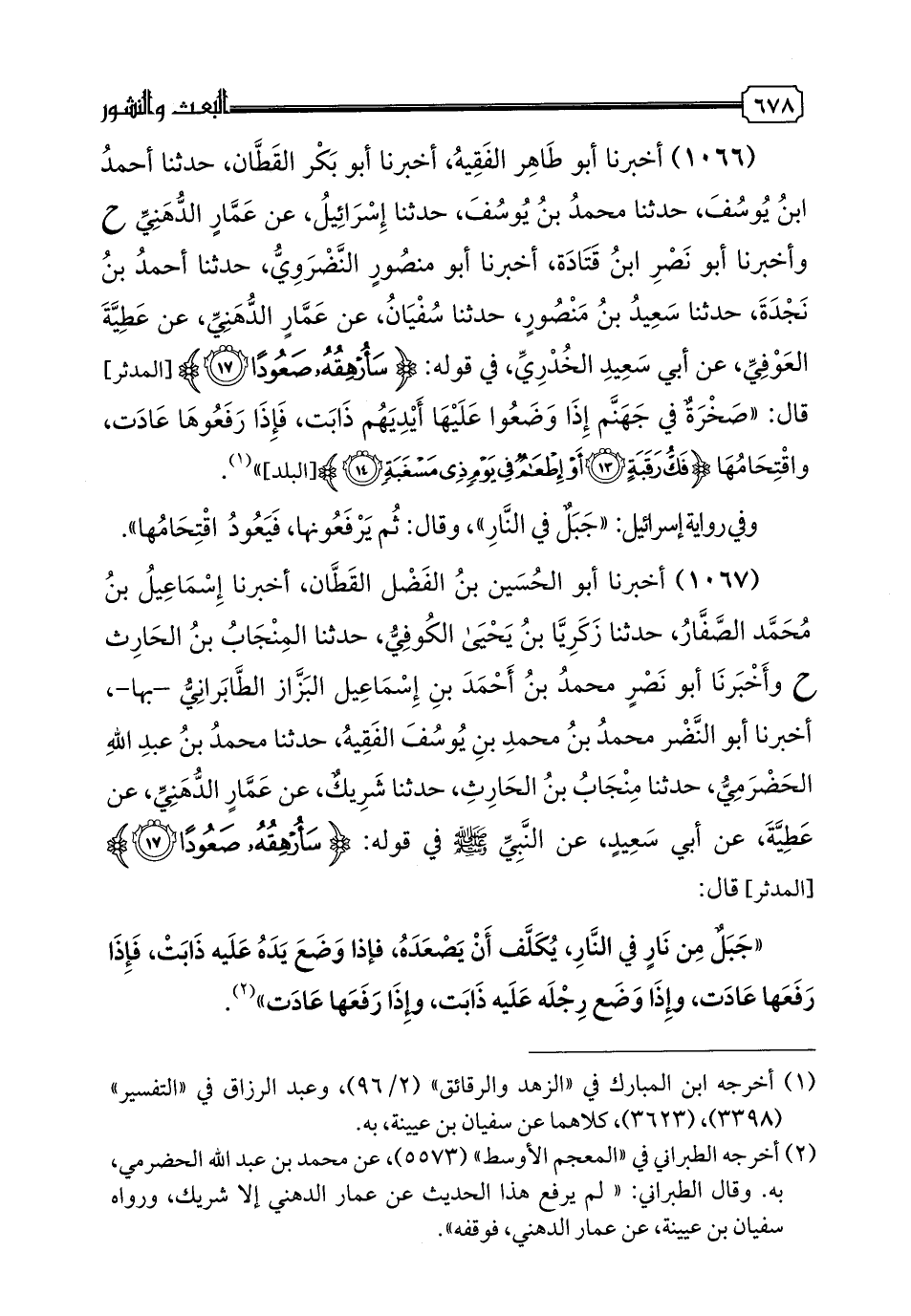 وَأَخْبَرَنَا أَبُو نَصْرِ بْنُ قَتَادَةَ، أخبرنا أَبُو مَنْصُورٍ النَّضْرَوِيُّ، حدثنا أَحْمَدُ بْنُ نَجْدَةَ، حدثنا سَعِيدُ بْنُ مَنْصُورٍ، حدثنا سُفْيَانُ، عَنْ عَمَّارٍ الدُّهْنِيِّ، عَنْ عَطِيَّةَ الْعَوْفِيِّ، عَنْ أَبِي سَعِيدٍ الْخُدْرِيِّ، فِي قَوْلِهِ: {سَأُرْهِقُهُ صَعُودًا}، قَالَ: صَخْرَةٌ فِي جَهَنَّمَ إِذَا وَضَعُوا عَلَيْهَا أَيْدِيَهُمْ ذَابَتْ، فَإِذَا رَفَعُوهَا عَادَتْ، وَاقْتِحَامُهَا {فَكُّ رَقَبَةٍ أَوْ إِطْعَامٌ فِي يَوْمٍ ذِي مَسْغَبَةٍ}، وَفِي رِوَايَةِ إِسْرَائِيلَ: جَبَلٌ فِي النَّارِ، وَقَالَ: ثُمَّ يَرْفَعُونَهَا، فَيَعُودُ اقْتِحَامُهَا "