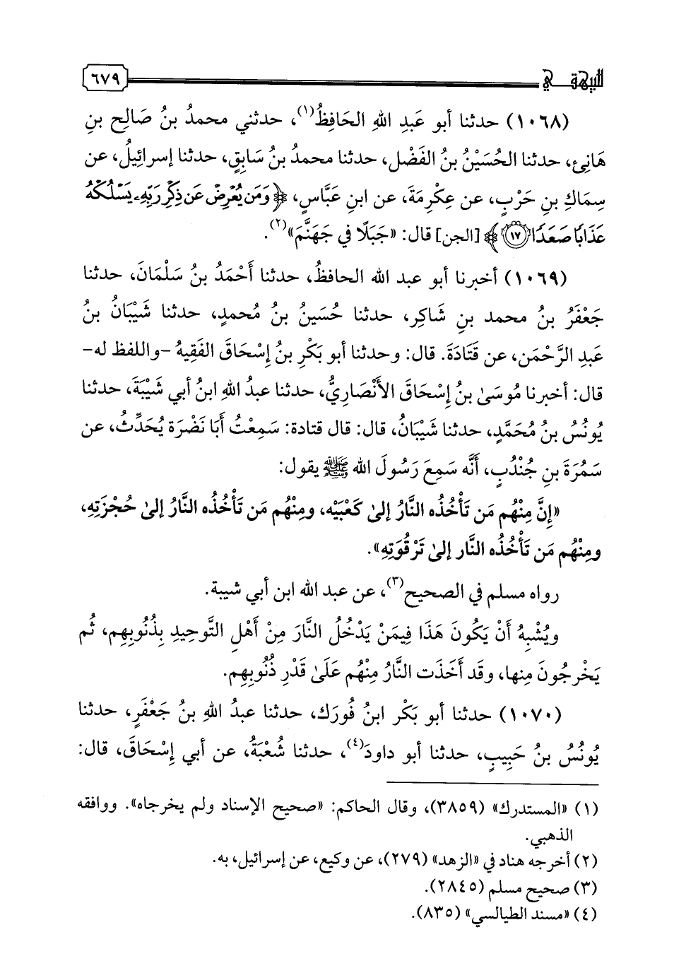 1069 - أَخْبَرَنَا أَبُو عَبْدِ اللَّهِ الْحَافِظُ، حدثنا أَحْمَدُ بْنُ سَلْمَانَ، حدثنا جَعْفَرُ بْنُ مُحَمَّدِ بْنِ شَاكِرٍ، حدثنا حُسَيْنُ بْنُ مُحَمَّدٍ، حدثنا شَيْبَانُ بْنُ عَبْدِ الرَّحْمَنِ، عَنْ قَتَادَةَ قَالَ: وحدثنا أَبو بكر بْنُ إِسْحَاقَ الْفَقِيهُ، -وَاللَّفْظُ لَهُ-، قَالَ: أخبرنا مُوسَى بْنُ إِسْحَاقَ الْأَنْصَارِيُّ، حدثنا عَبْدُ اللَّهِ بْنُ أَبِي شَيْبَةَ، حدثنا يُونُسُ بْنُ مُحَمَّدٍ، حدثنا شَيْبَانُ، قَالَ: قَالَ قَتَادَةُ: سَمِعْتُ أَبَا نَضْرَةَ، يُحَدِّثُ، عَنْ سَمُرَةَ بْنِ جُنْدُبٍ، أَنَّهُ سَمِعَ رَسُولَ اللَّهِ صَلَّى اللهُ عَلَيْهِ وَسَلَّمَ يَقُولُ: «إِنَّ مِنْهُمَ مَنْ تَأخُذُهُ النَّارُ إِلَى كَعْبَيْهِ، وَمِنْهُمْ مَنْ تَأخُذُهُ النَّارُ إِلَى حُجْزَتِهِ، وَمِنْهُمْ مَنْ تَأخُذُهُ النَّارُ إِلَى تَرْقُوَتِهِ»