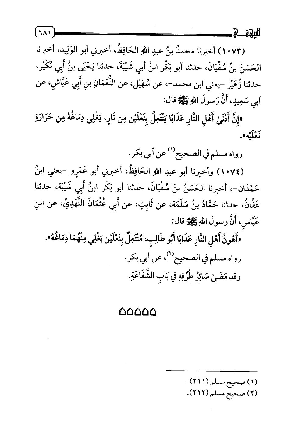 1074 - وَأَخْبَرَنَا أَبُو عَبْدِ اللَّهِ الْحَافِظُ، أَخْبَرَنِي أَبُو عَمْرٍو -يَعْنِي ابْنَ حَمْدَانَ-، أخبرنا الْحَسَنُ بْنُ سُفْيَانَ، حدثنا أَبُو بَكْرِ بْنُ أَبِي شَيْبَةَ، حدثنا عَفَّانُ، حدثنا حَمَّادُ بْنُ سَلَمَةَ، عَنْ ثَابِتٍ، عَنْ أَبِي عُثْمَانَ النَّهْدِيِّ، عَنِ ابْنِ عَبَّاسٍ، أَنَّ رَسُولَ اللَّهِ صَلَّى اللهُ عَلَيْهِ وَسَلَّمَ قَالَ: «أَهْوَنُ أَهْلِ النَّارِ عَذَابًا أَبُو طَالِبٍ، مُنْتَعِلٌ بِنَعْلَيْنِ يَغْلِي مِنْهُمَا دِمَاغُهُ»