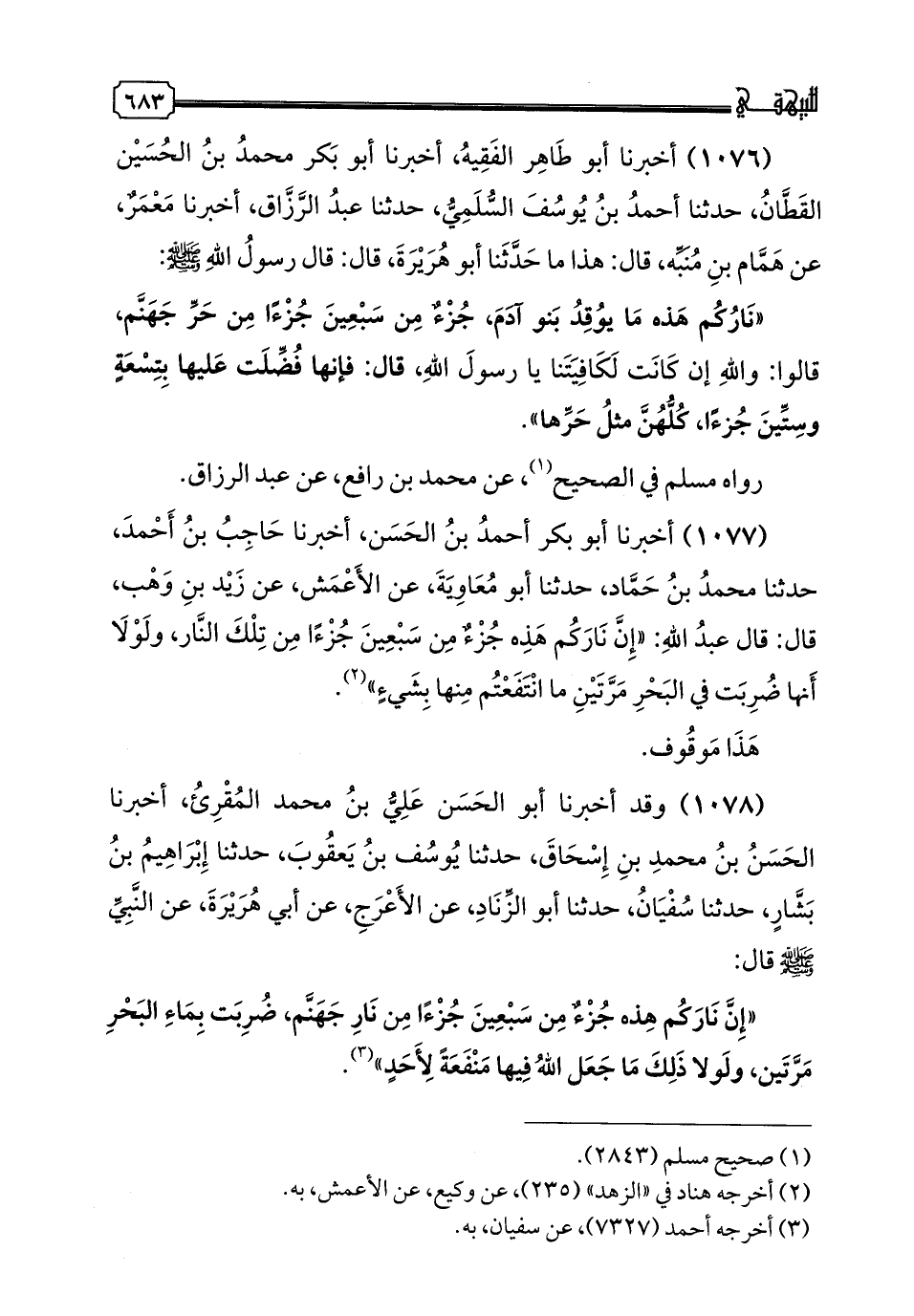 1076 - أَخْبَرَنَا أَبُو طَاهِرٍ الْفَقِيهُ، أخبرنا أَبُو بَكْرٍ مُحَمَّدُ بْنُ الْحُسَيْنِ الْقَطَّانُ، حدثنا أَحْمَدُ بْنُ يُوسُفَ السُّلَمِيُّ، حدثنا عَبْدُ الرَّزَّاقِ، أخبرنا مَعْمَرٌ، عَنْ هَمَّامِ بْنِ مُنَبِّهٍ، قَالَ: هَذَا مَا حَدَّثَنَا أَبُو هُرَيْرَةَ، قَالَ: قَالَ رَسُولُ اللَّهِ صَلَّى اللهُ عَلَيْهِ وَسَلَّمَ: «نَارُكُمْ هَذِهِ مَا يُوقِدُ بَنُو آدَمَ جُزْءٌ مِنْ سَبْعِينَ جُزْءًا مِنْ حَرِّ جَهَنَّمَ»، قَالُوا: وَاللَّهِ إِنْ كَانَتْ لَكَافِيَتَنَا يَا رَسُولَ اللَّهِ، قَالَ: «فَإِنَّهَا فُضِّلَتْ عَلَيْهَا بِتِسْعَةٍ وَسِتِّينَ جُزْءًا، كُلُّهُنَّ مِثْلُ حَرِّهَا»