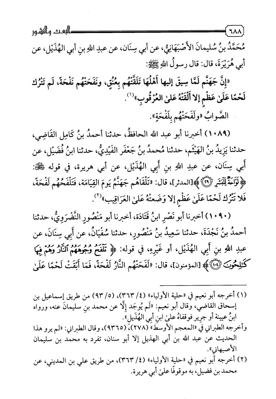 1089 - أَخْبَرَنَا أَبُو عَبْدِ اللَّهِ الْحَافِظُ، حدثنا أَحْمَدُ بْنُ كَامِلٍ الْقَاضِي، حدثنا يَزِيدُ بْنُ الْهَيْثَمِ، حدثنا مُحَمَّدُ بْنُ جَعْفَرٍ الْفيدي، حدثنا ابْنُ فُضَيْلٍ، عَنْ أَبِي سِنَانٍ، عَنْ عَبْدِ اللَّهِ بْنِ أَبِي الْهُذَيْلِ، عَنْ أَبِي هُرَيْرَةَ، فِي قَوْلِهِ عَزَّ وَجَلَّ: {لَوَّاحَةٌ لِلْبَشَرِ}، قَالَ: تَلْقَاهُمْ جَهَنَّمُ يَوْمَ الْقِيَامَةِ فَتَلْفَحُهُمْ لَفْحَةً، فَلَا تَتْرُكْ لَحْمًا عَلَى عَظْمٍ إِلَّا وَضَعَتْهُ عَلَى الْعَرَاقِيبِ "