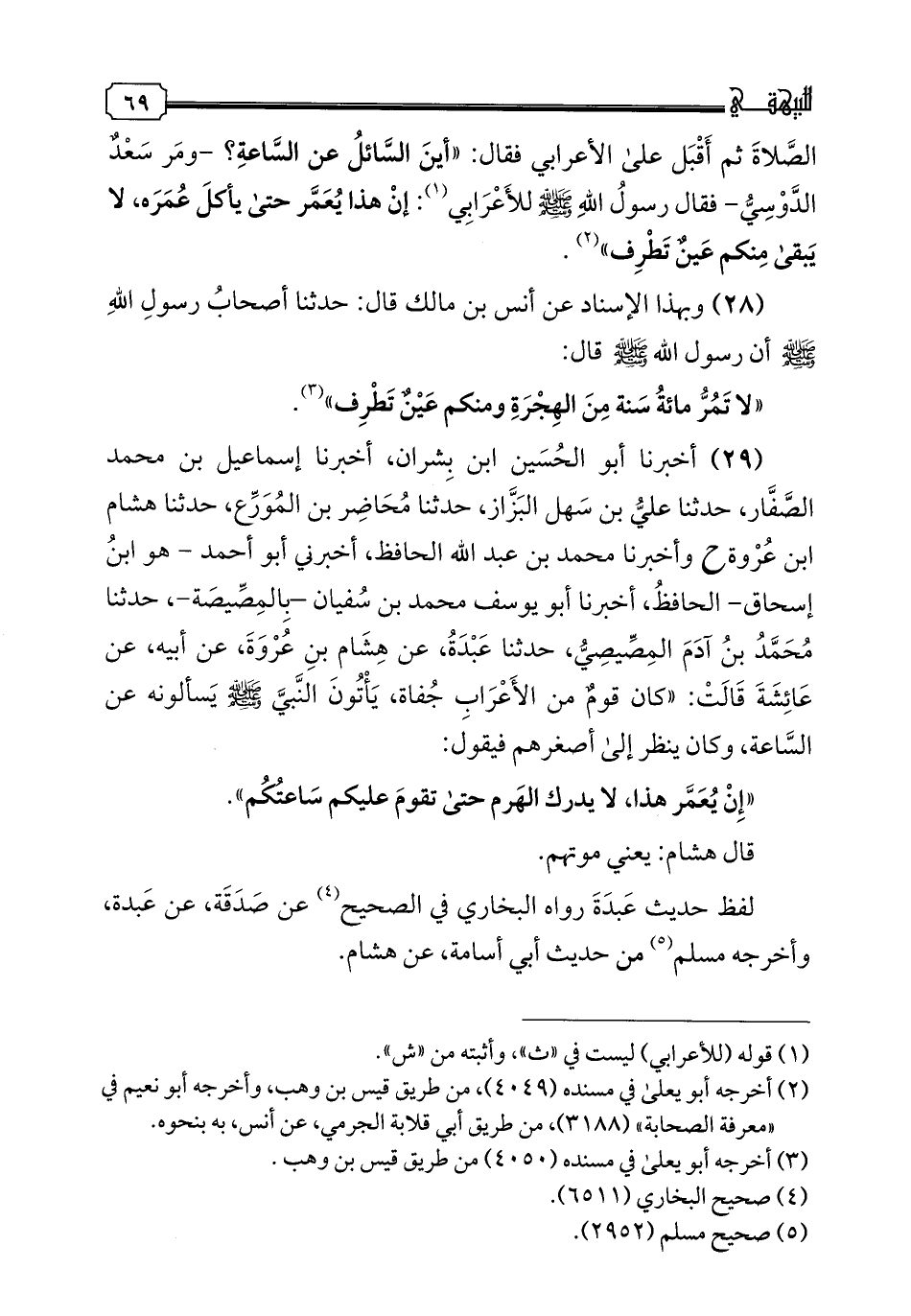 29 - أخبرنا أبو الحسين ابن بشران، أخبرنا إسماعيل بن محمد الصفار، حدثنا علي بن سهل البزاز، حدثنا محاضر بن المورع، حدثنا هشام بن عروة ح وأخبرنا محمد بن عبد الله الحافظ، أخبرني أبو أحمد - هو ابن إسحاق - الحافظ، أخبرنا أبو يوسف محمد بن سفيان - بالمصيصة -، حدثنا محمد بن آدم المصيصي، حدثنا عبدة، عن هشام بن عروة، عن أبيه، عن عائشة قالت: "كان قوم من الأعراب جفاة يأتون النبي صلى الله عليه وسلم يسألونه عن الساعة، وكان ينظر إلى أصغرهم فيقول: "إن يعمر هذا، لا يدرك الهرم حتى تقوم عليكم ساعتكم". قال هشام: يعني موتهم. لفظ حديث عبدة رواه البخاري في الصحيح عن صدقة، عن عبدة، وأخرجه مسلم من حديث أبي أسامة، عن هشام.