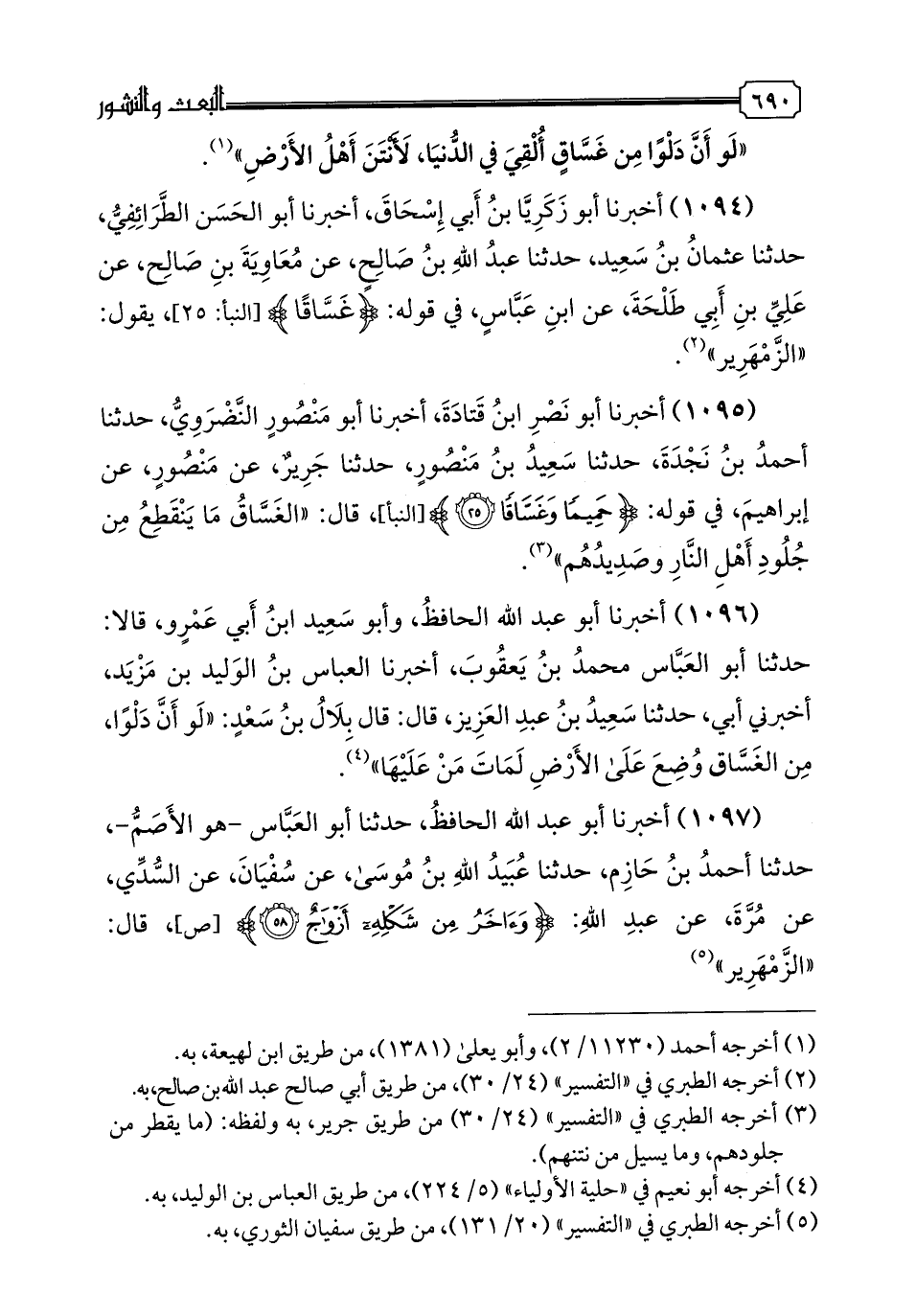 1095 - أَخْبَرَنَا أَبُو نَصْرِ بْنُ قَتَادَةَ، أخبرنا أَبُو مَنْصُورٍ النَّضْرَوِيُّ، حدثنا أَحْمَدُ بْنُ نَجْدَةَ، حدثنا سَعِيدُ بْنُ مَنْصُورٍ، حدثنا جَرِيرٌ، عَنْ مَنْصُورٍ، عَنْ إِبْرَاهِيمَ، فِي قَوْلِهِ: {حَمِيمًا وَغَسَّاقًا}، قَالَ: " الْغَسَاقُ مَا يَنْقَطِعُ مِنْ جُلُودِ أَهْلِ النَّارِ وَصَدِيدِهِمْ