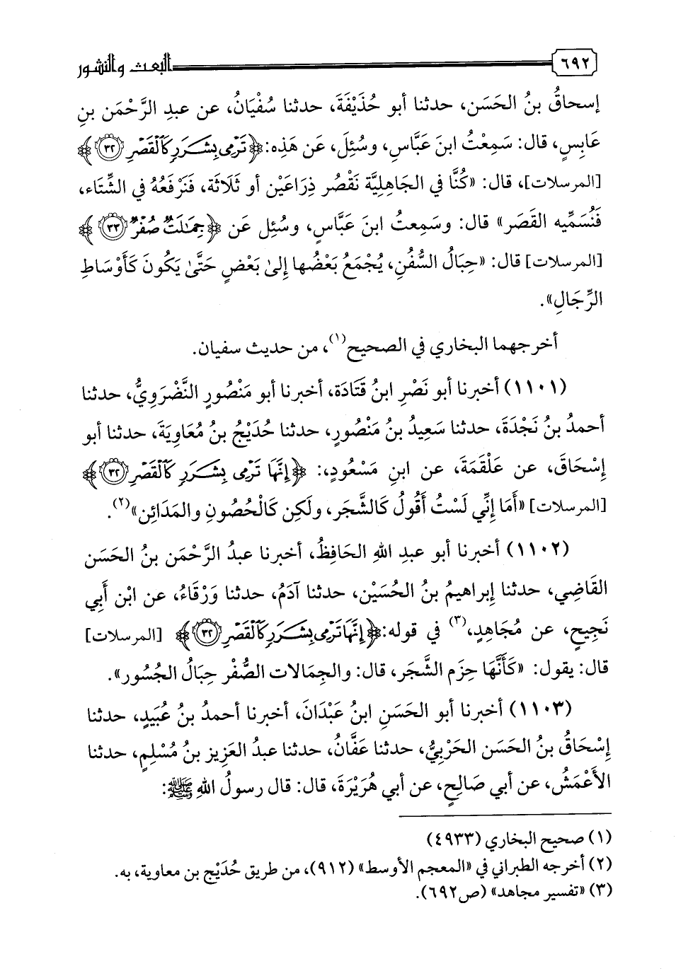 1101 - أَخْبَرَنَا أَبُو نَصْرِ بْنُ قَتَادَةَ، أخبرنا أَبُو مَنْصُورٍ النَّضْرَوِيُّ، حدثنا أَحْمَدُ بْنُ نَجْدَةَ، حدثنا سَعِيدُ بْنُ مَنْصُورٍ، حدثنا حُديجُ بْنُ مُعَاوِيَةَ، حدثنا أَبُو إِسْحَاقَ، عَنْ عَلْقَمَةَ، عَنِ ابْنِ مَسْعُودٍ،: {إِنَّهَا تَرْمِي بِشَرَرٍ كَالْقَصْرِ}: أَمَا إِنِّي لَسْتُ أَقُولُ كَالشَّجَرِ، وَلَكِنْ كَالْحُصُونِ وَالْمَدَائِنِ "