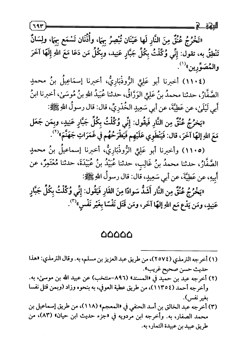 1104 - أَخْبَرَنَا أَبُو عَلِيٍّ الرُّوذْبَارِيُّ، أخبرنا إِسْمَاعِيلُ بْنُ مُحَمَّدٍ الصَّفَّارُ، حدثنا مُحَمَّدُ بْنُ عَلِيٍّ الْوَرَّاقُ، حدثنا عُبَيْدُ اللَّهِ بْنُ مُوسَى، أخبرنا ابْنُ أَبِي لَيْلَى، عَنْ عَطِيَّةَ، عَنْ أَبِي سَعِيدٍ الْخُدْرِيِّ، قَالَ: قَالَ رَسُولُ اللَّهِ صَلَّى اللهُ عَلَيْهِ وَسَلَّمَ: " يَخْرُجُ عُنُقٌ مِنَ النَّارِ فَيَقُولُ: إِنِّي وُكِّلْتُ بِكُلِّ جَبَّارٍ عَنِيدٍ، وَبِمَنْ جَعَلَ مَعَ اللَّهِ إِلَهًا آخَرَ " قَالَ: «فَيَنْطَوِي عَلَيْهِمْ فَيْطَرَحُهُمْ فِي غَمَرَاتِ جَهَنَّمَ»
