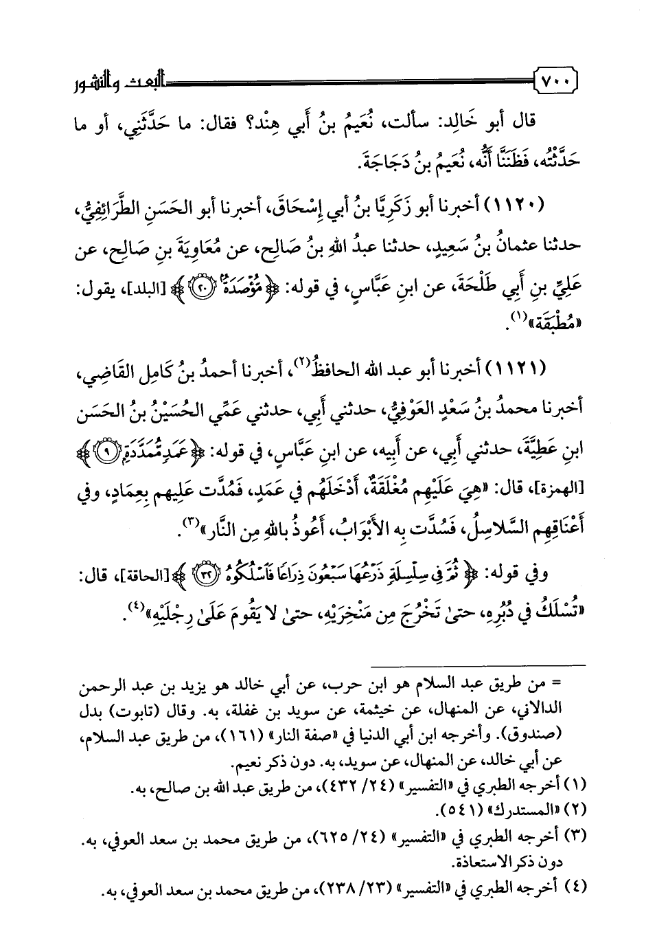1121 - أَخْبَرَنَا أَبُو عَبْدِ اللَّهِ الْحَافِظُ، أخبرنا أَحْمَدُ بْنُ كَامِلٍ الْقَاضِي، أخبرنا مُحَمَّدُ بْنُ سَعْدٍ الْعَوْفِيُّ، حَدَّثَنِي أَبِي، حَدَّثَنِي عَمِّي الْحُسَيْنُ بْنُ الْحَسَنِ بْنِ عَطِيَّةَ، حَدَّثَنِي أَبِي، عَنْ أَبِيهِ، عَنِ ابْنِ عَبَّاسٍ، فِي قَوْلِهِ: {عَمَدٍ مُمَدَّدَةٍ}، قَالَ: هِيَ عَلَيْهِمْ مُغْلَقَةٌ، أَدْخَلَهُمْ فِي عَمَدٍ، فَمُدَّتْ عَلَيْهِمْ بِعِمَادٍ، وَفِي أَعْنَاقِهِمُ السَّلَاسِلُ، فَسُدَّتْ بِهِ الْأَبْوَابُ، أَعُوذُ بِاللَّهِ مِنَ النَّارِ " وَفِي قَوْلِهِ: {ثُمَّ فِي سِلْسِلَةٍ ذَرْعُهَا سَبْعُونَ ذِرَاعًا فَاسْلُكُوهُ}، قَالَ: «تُسْلَك فِي دُبُرِهِ حَتَّى تَخْرُجَ مِنْ مَنْخِرِهِ، حَتَّى لَا يَقُومَ عَلَى رِجْلَيْهِ»