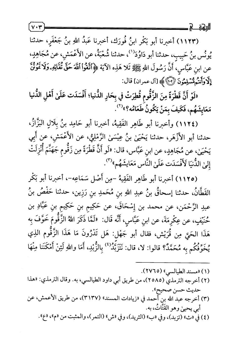 1123 - أَخْبَرَنَا أَبُو بَكْرِ بْنُ فُورَكٍ، أخبرنا عَبْدُ اللَّهِ بْنُ جَعْفَرٍ، حدثنا يُونُسُ بْنُ حَبِيبٍ، حدثنا أَبُو دَاوُدَ، حدثنا شُعْبَةُ، عَنِ الْأَعْمَشِ، عَنْ مُجَاهِدٍ، عَنِ ابْنِ عَبَّاسٍ، أَنَّ رَسُولَ اللَّهِ صَلَّى اللهُ عَلَيْهِ وَسَلَّمَ تَلَا هَذِهِ الْآيَةَ {اتَّقُوا اللَّهَ حَقَّ تُقَاتِهِ وَلَا تَمُوتُنَّ إِلَّا وَأَنْتُمْ مُسْلِمُون}، قَالَ: «لَوْ أَنَّ قَطْرَةً مِنَ الزَّقُّومِ قُطِرَتْ فِي بِحَارِ الدُّنْيَا أَفْسَدَتْ عَلَى أَهْلِ الدُّنْيَا مَعَايِشَهُمْ، فَكَيْفَ بِمَنْ يَكُونُ طَعَامَهُ؟»