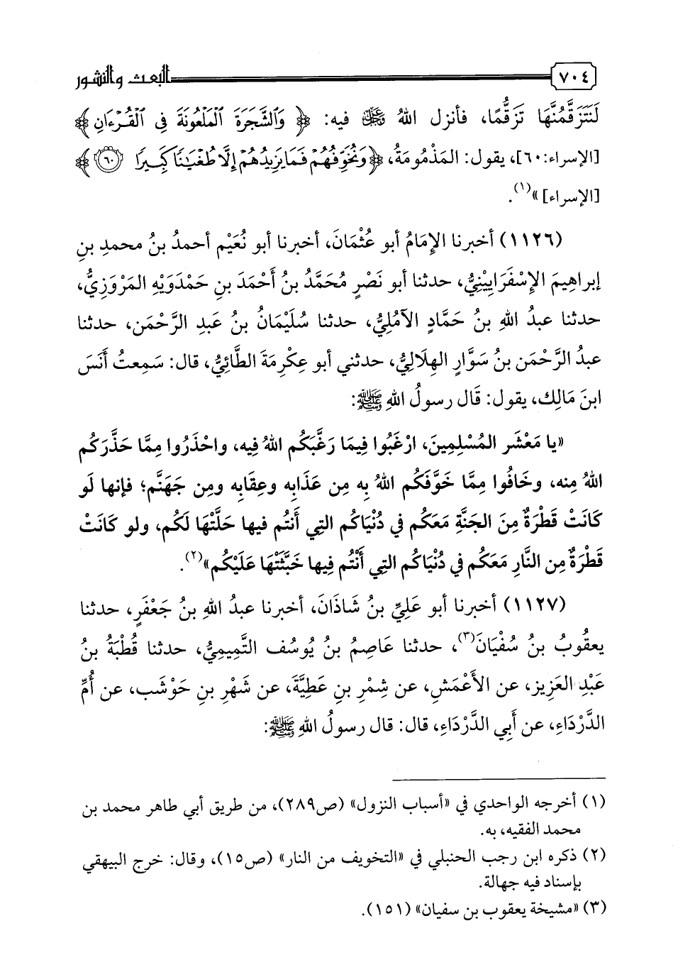 1126 - أَخْبَرَنَا الْإِمَامُ أَبُو عُثْمَانَ، أخبرنا أَبُو نُعَيْمٍ أَحْمَدُ بْنُ مُحَمَّدِ بْنِ إِبْرَاهِيمَ الْإِسْفَرَايِينِيُّ، حدثنا أَبُو نَصْرٍ مُحَمَّدُ بْنُ أَحْمَدَ بْنِ حَمْدَوَيْهِ الْمَرْوَزِيُّ، حدثنا عَبْدُ اللَّهِ بْنُ حَمَّادٍ الْآمُلِيُّ، حدثنا سُلَيْمَانُ بْنُ عَبْدِ الرَّحْمَنِ، حدثنا عَبْدُ الرَّحْمَنِ بْنُ سَوَّارٍ الْهِلَالِيُّ، حَدَّثَنِي أَبُو عِكْرِمَةَ الطَّائِيُّ، قَالَ: سَمِعْتُ أَنَسَ بْنَ مَالِكٍ، يَقُولُ: قَالَ رَسُولُ اللَّهِ صَلَّى اللهُ عَلَيْهِ وَسَلَّمَ: «يَا مَعْشَرَ الْمُسْلِمِينَ، ارْغَبُوا فِيمَا رَغَبَّكُمُ اللَّهُ فِيهِ، وَاحْذَرُوا مِمَّا حَذَّرَكُمُ اللَّهُ مِنْهُ، وَخَافُوا مِمَّا خَوَّفَكُمُ اللَّهُ بِهِ مِنْ عَذَابِهِ وَعِقَابِهِ وَمِنْ جَهَنَّمَ؛ فَإِنَّهَا لَوْ كَانَتْ قَطْرَةً مِنَ الْجَنَّةِ مَعَكُمْ فِي دُنْيَاكُمُ الَّتِي أَنْتُمْ فِيهَا حَلَّتْهَا لَكُمْ، وَلَوْ كَانَتْ قَطْرَةٌ مِنَ النَّارِ مَعَكُمْ فِي دُنْيَاكُمُ الَّتِي أَنْتُمْ فِيهَا خَبَّثَتْهَا عَلَيْكُمْ»