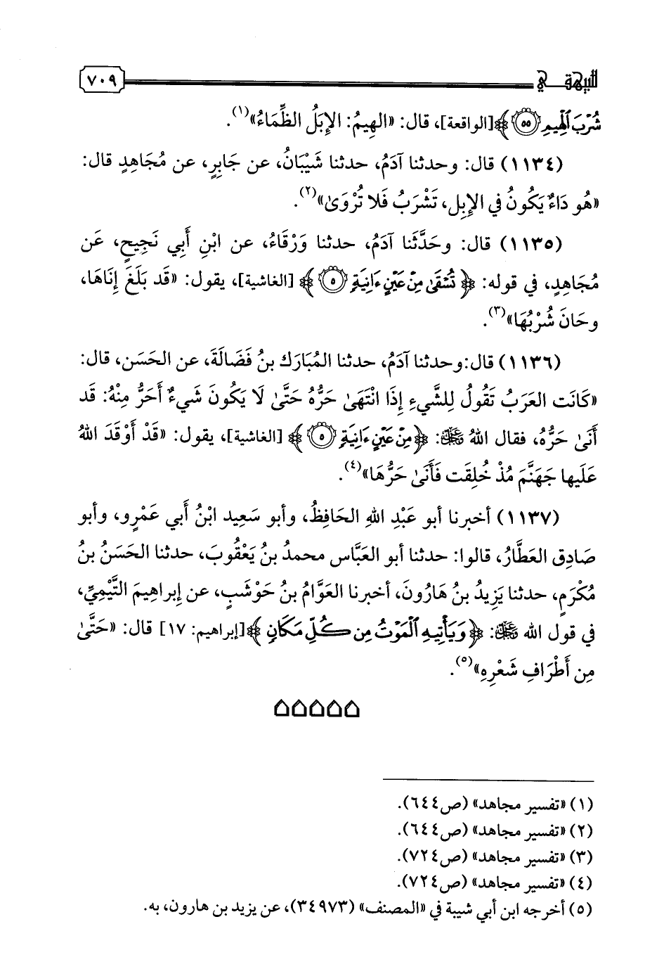 1135 - قال: وحدثنا آدَمُ، حدثنا وَرْقَاءُ، عَنِ ابْنِ أَبِي نَجِيحٍ، عَنْ مُجَاهِدٍ، فِي قَوْلِهِ: {تُسْقَى مِنْ عَيْنٍ آنِيَةٍ}، يَقُولُ: قَدْ بَلَغَ إنَاهَا، وَحَانَ شُرْبُهَا "