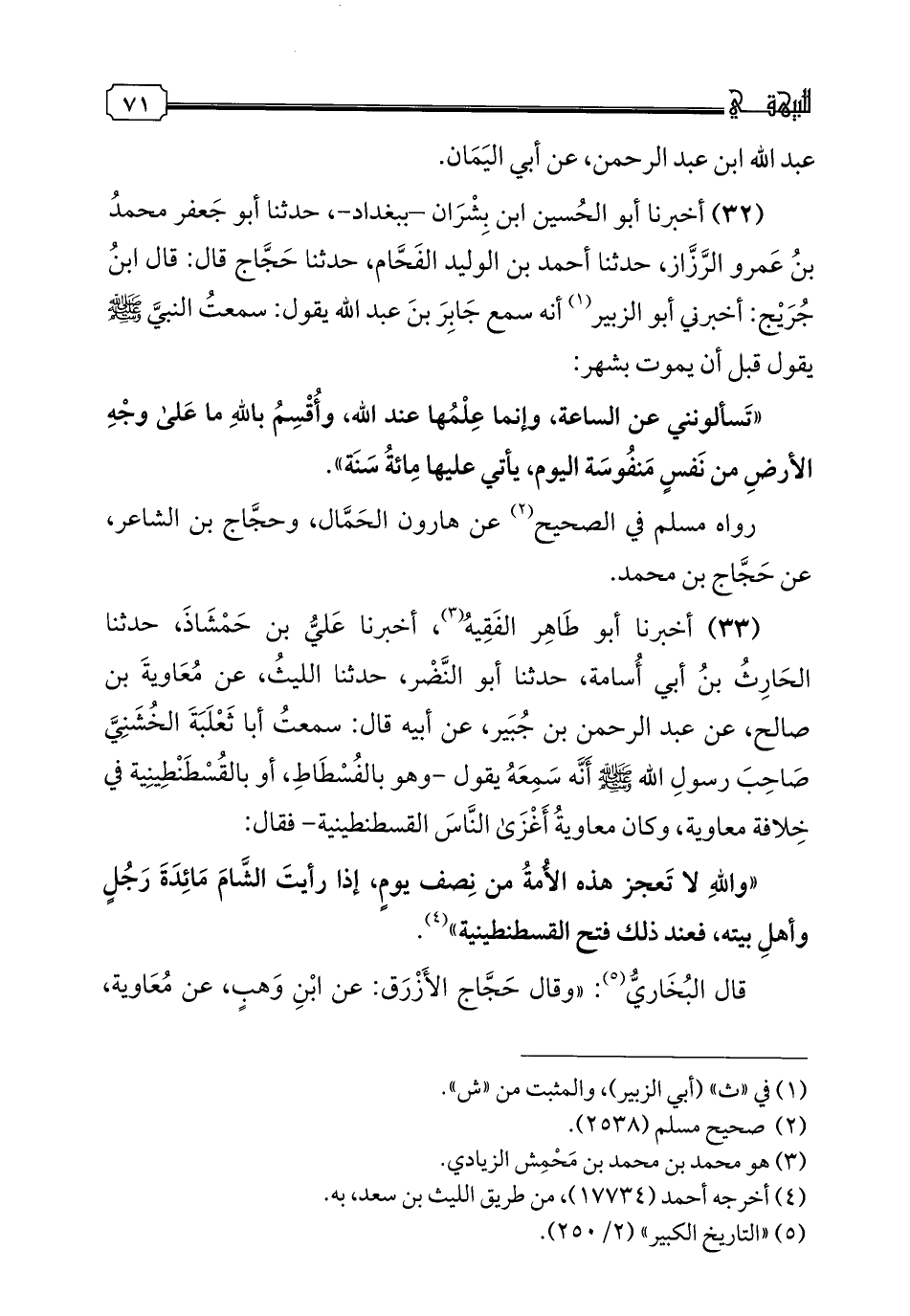 32 - أخبرنا أبو الحسين بن بشران -ببغداد- حدثنا أبو جعفر محمد بن عمرو الرزاز، حدثنا أحمد بن الوليد الفحام، حدثنا حجاج قال: قال ابن جريج: أخبرني أبو الزبير أنه سمع جابر بن عبد الله يقول: سمعت النبي صلى الله عليه وسلم يقول قبل أن يموت بشهر: "تسألونني عن الساعة، وإنما علمها عند الله، وأقسم بالله ما على وجه الأرض من نفس منفوسة اليوم، يأتي عليها مائة سنة". رواه مسلم في الصحيح عن هارون الحمال، وحجاج بن الشاعر، عن حجاج بن محمد.