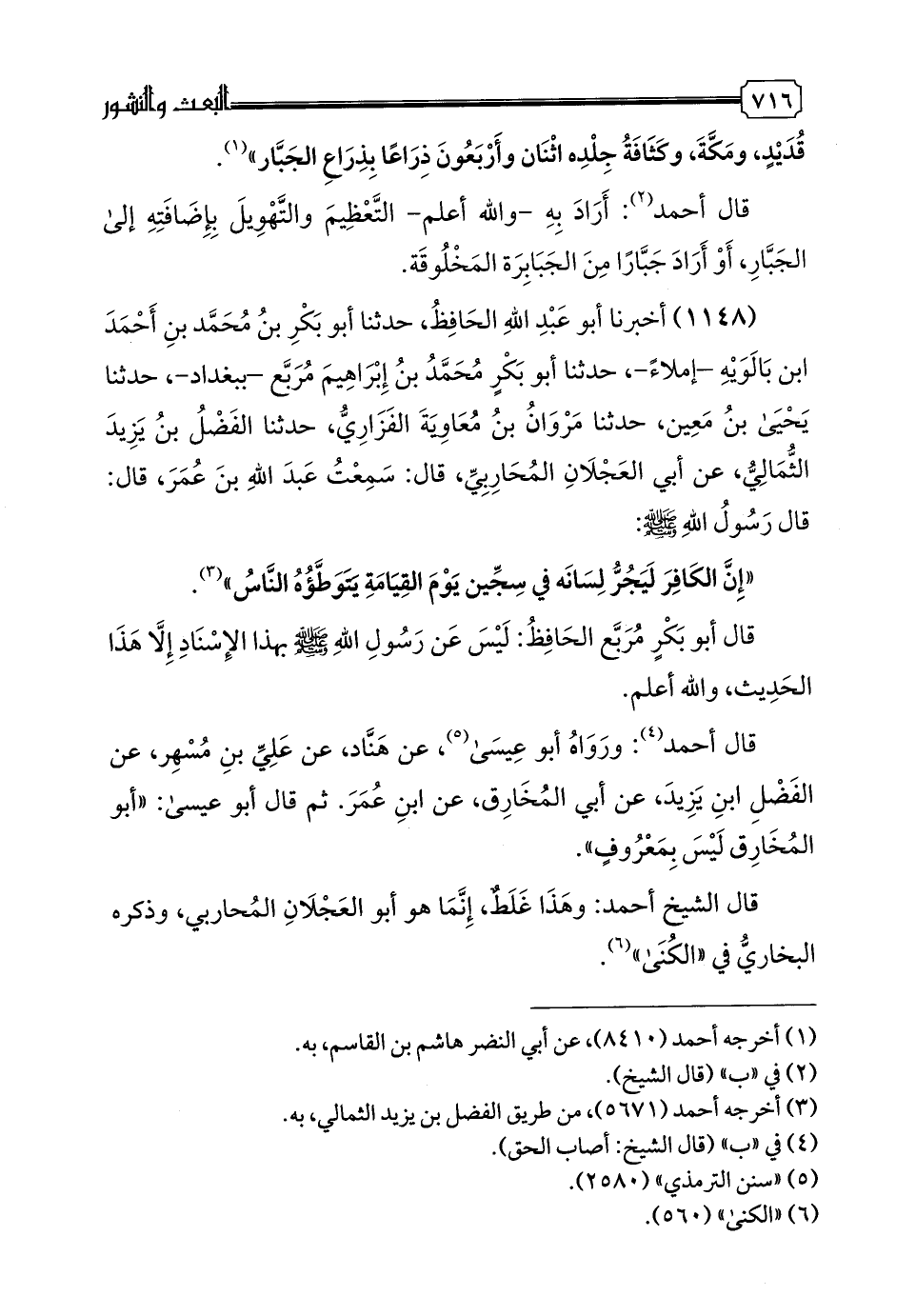 1148 - أَخْبَرَنَا أَبُو عَبْدِ اللَّهِ الْحَافِظُ، حدثنا أَبُو بَكْرِ بْنُ مُحَمَّدِ بْنِ أَحْمَدَ بْنِ بَالَوَيْهِ، إِمْلَاءً، حدثنا أَبُو بَكْرٍ مُحَمَّدُ بْنُ إِبْرَاهِيمَ مُربع -بِبَغْدَادَ-، حدثنا يَحْيَى بْنُ مَعِينٍ، حدثنا مَرْوَانُ بْنُ مُعَاوِيَةَ الْفَزَارِيُّ، حدثنا الْفَضْلُ بْنُ يَزِيدَ الثُّمَالِيُّ، عَنْ أَبِي الْعَجْلَانِ الْمُحَارِبِيِّ، قَالَ: سَمِعْتُ عَبْدَ اللَّهِ بْنَ عُمَرَ، قَالَ: قَالَ رَسُولُ اللَّهِ صَلَّى اللهُ عَلَيْهِ وَسَلَّمَ: «إِنَّ الْكَافِرَ لَيَجُرُّ لِسَانَهُ فِي سِجِّينٍ يَوْمَ الْقِيَامَةِ يَتَوَطَّؤه النَّاسُ»