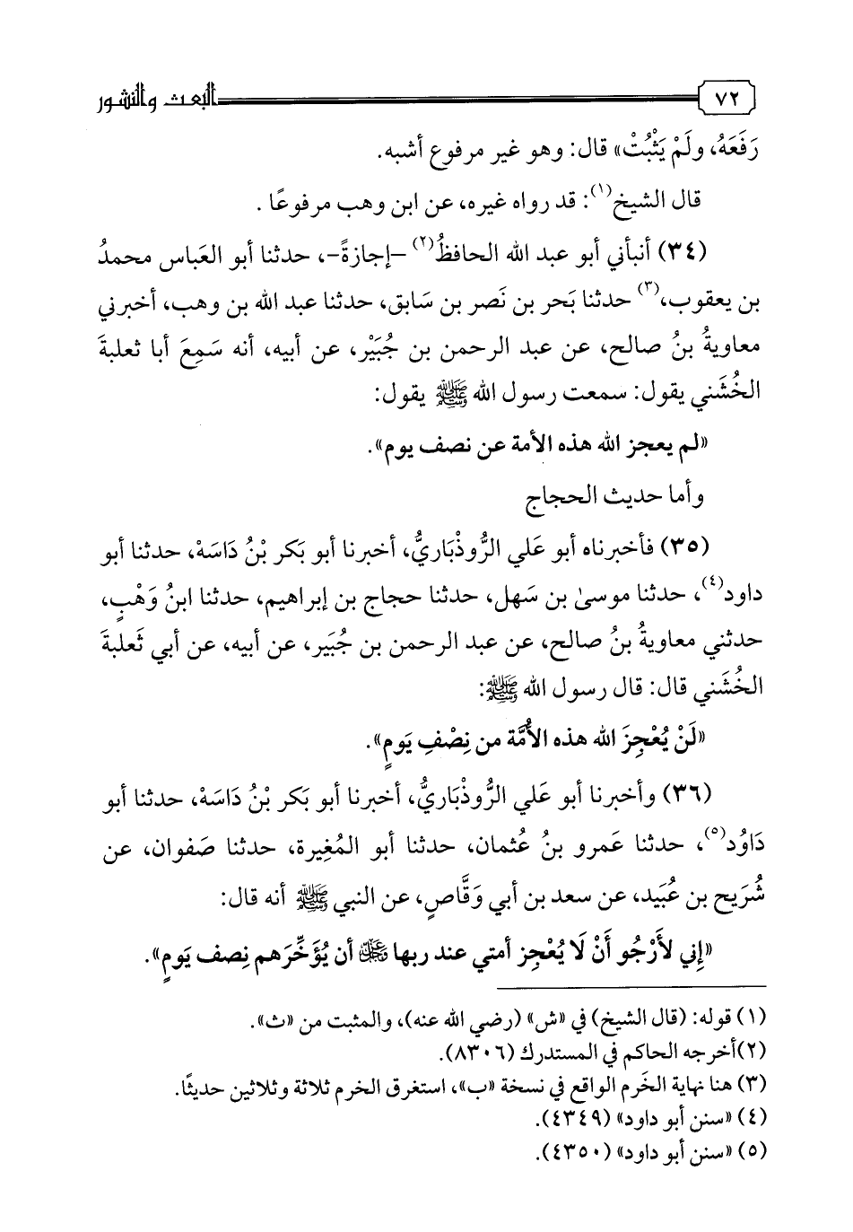 34 - أنبأني أبو عبد الله الحافظ -إجازة-، حدثنا أبو العباس محمد بن يعقوب، حدثنا بحر بن نصر بن سابق، حدثنا عبد الله بن وهب، أخبرني معاوية بن صالح، عن عبد الرحمن بن جبير، عن أبيه، أنه سمع أبا ثعلبة الخشني يقول: سمعت رسول الله صلى الله عليه وسلم يقول: "لم يعجز الله هذه الأمة عن نصف يوم".