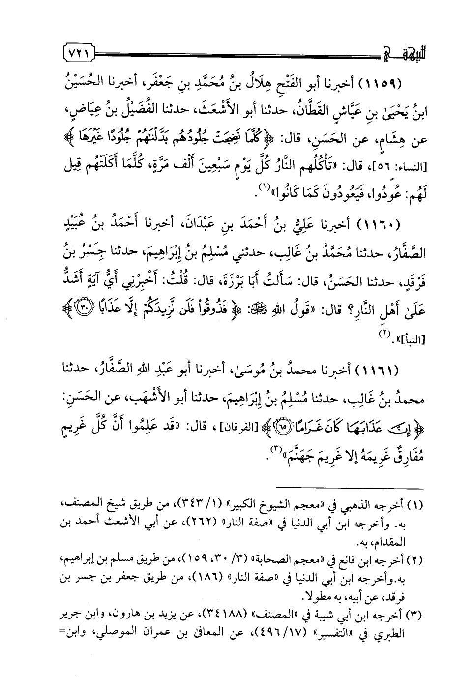 1159 - أَخْبَرَنَا أَبُو الْفَتْحِ هِلَالُ بْنُ مُحَمَّدِ بْنِ جَعْفَرٍ، أخبرنا الْحُسَيْنُ بْنُ يَحْيَى بْنِ عَياش الْقَطَّانُ، حدثنا أَبُو الْأَشْعَثِ، حدثنا الْفُضَيْلُ بْنُ عِيَاضٍ، عَنْ هِشَامٍ، عَنِ الْحَسَنِ، قَالَ: {كُلَّمَا نَضِجَتْ جُلُودُهُمْ بَدَّلْنَاهُمْ جُلُودًا غَيْرَهَا}، قَالَ: " تَأكُلُهُمُ النَّارُ كُلَّ يَوْمٍ سَبْعِينَ أَلْفَ مَرَّةٍ كُلَّمَا أَكَلَتْهُمْ قِيلَ لَهُمْ: عُودُوا، فَيَعُودُونَ كَمَا كَانُوا "