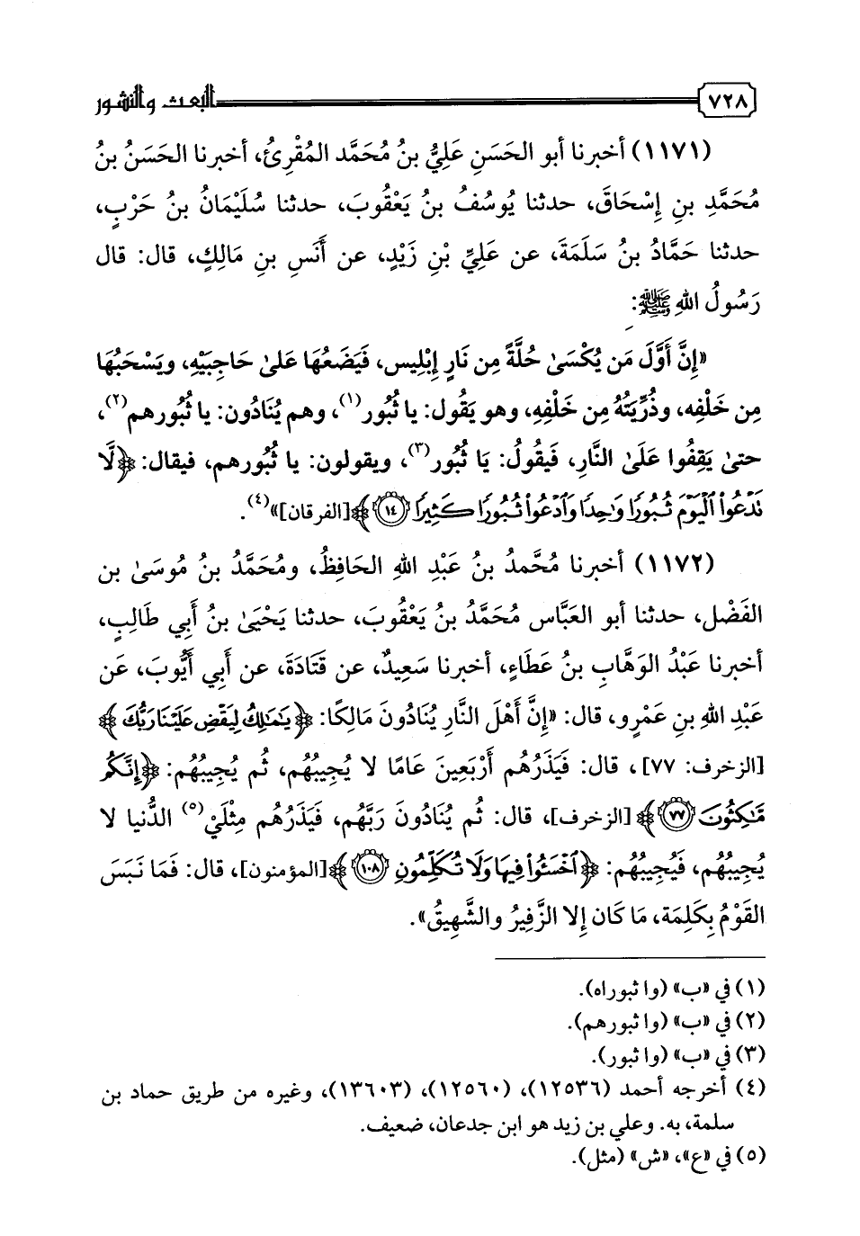 1171 - أَخْبَرَنَا أَبُو الْحَسَنِ عَلِيُّ بْنُ مُحَمَّدٍ الْمُقْرِئُ، أخبرنا الْحَسَنُ بْنُ مُحَمَّدِ بْنِ إِسْحَاقَ، حدثنا يُوسُفُ بْنُ يَعْقُوبَ، حدثنا سُلَيْمَانُ بْنُ حَرْبٍ، حدثنا حَمَّادُ بْنُ سَلَمَةَ، عَنْ عَلِيِّ بْنِ زَيْدٍ، عَنْ أَنَسِ بْنِ مَالِكٍ، قَالَ: قَالَ رَسُولُ اللَّهِ صَلَّى اللهُ عَلَيْهِ وَسَلَّمَ: " إِنَّ أَوَّلَ مَنْ يُكْسَى حُلَّةً مِنْ نَارٍ إِبْلِيسُ، فَيَضَعُهَا عَلَى حَاجِبَيْهِ، وَيَسْحَبُهَا مِنْ خَلْفِهِ، وَذُرِّيَّتُهُ مِنْ خَلْفِهِ، وَهُوَ يَقُولُ: يَا ثُبُورُ، وَهُمْ يُنَادُونَ: يَا ثُبُورهُمْ، حَتَّى يَقِفُوا عَلَى النَّارِ، فَيَقُولُ: يَا ثُبُورُ، وَيَقُولُونَ: يَا ثُبُورهُمْ، فَيُقَالُ: {لَا تَدْعُوا الْيَوْمَ ثُبُورًا وَاحِدًا وَادْعُوا ثُبُورًا كَثِيرًا}