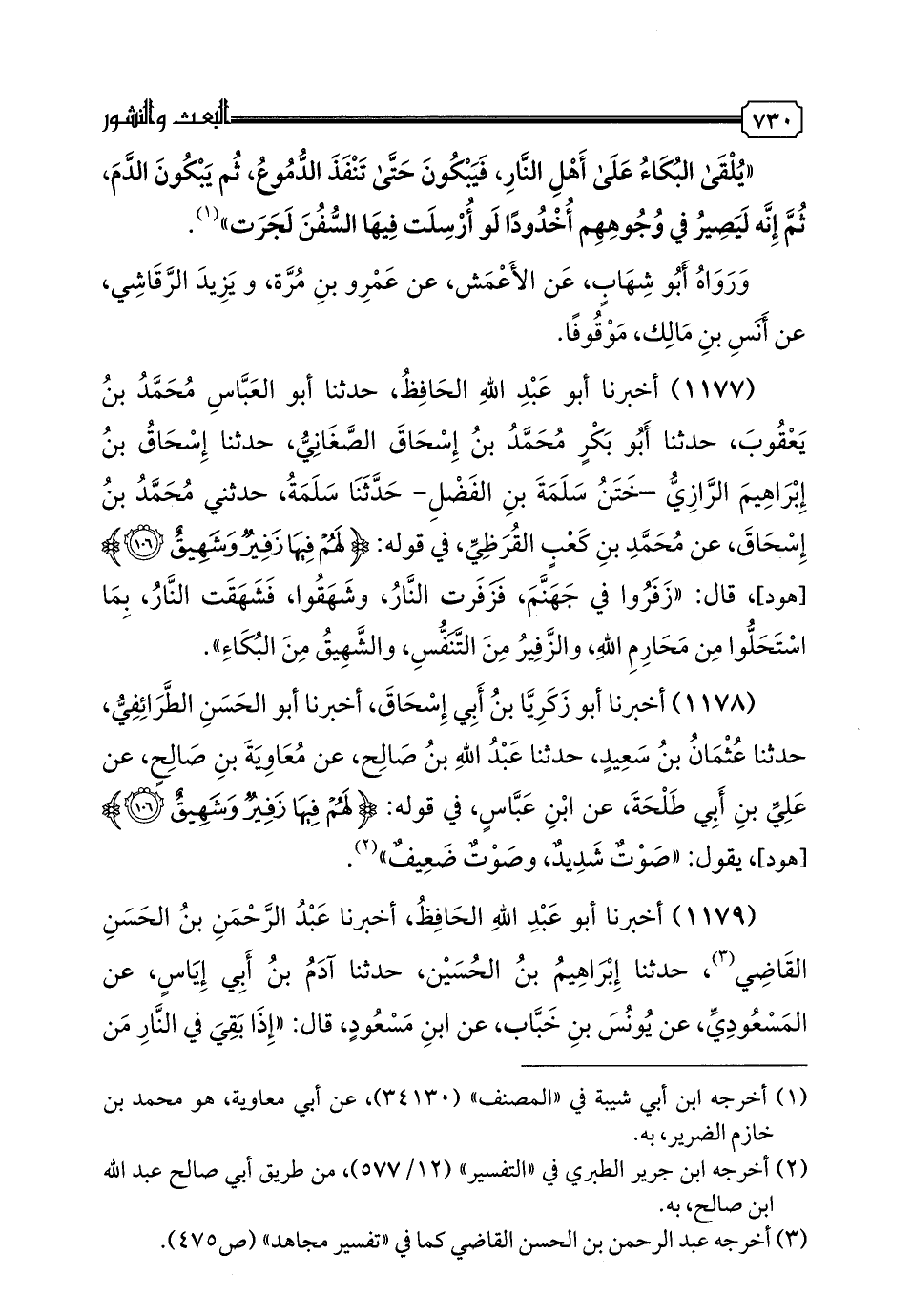 1179 - أَخْبَرَنَا أَبُو عَبْدِ اللَّهِ الْحَافِظُ، أخبرنا عَبْدُ الرَّحْمَنِ بْنُ الْحَسَنِ الْقَاضِي، حدثنا إِبْرَاهِيمُ بْنُ الْحُسَيْنِ، حدثنا آدَمُ بْنُ أَبِي أيَاسَ عن الْمَسْعُودِيُّ، عَنْ يُونُسَ بْنِ خَبَّابٍ، عَنِ ابْنِ مَسْعُودٍ، قَالَ: " إِذَا بَقِيَ فِي النَّارِ مَنْ يُخَلَّدُ فِيهَا جُعِلُوا فِي تَوَابِيتَ مِنْ نَارٍ، فِيهَا مَسَامِيرُ مِنْ نَارٍ، ثُمَّ جُعِلَتْ تِلْكَ التَّوَابِيتُ فِي تَوَابِيتَ مِنْ نَارٍ، ثُمَّ جُعِلَتْ تِلْكَ التَّوَابِيتُ فِي تَوَابِيتَ مِنْ نَارٍ، ثُمَّ قُذِفُوا فِي أَسْفَلَ الْجَحِيمِ، فَيَرَوْا أَنَّهُ لَا يُعَذَّبُ فِي النَّارِ أَحَدٌ غَيْرَهُمْ، ثُمَّ تَلَا ابْنُ مَسْعُودٍ: {لَهُمْ فِيهَا زَفِيرٌ وَهُمْ فِيهَا لَا يَسْمَعُونَ}